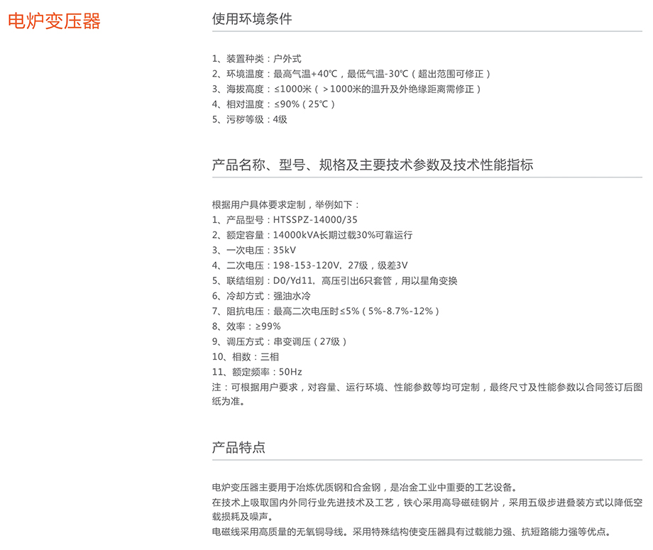 電爐變壓器,在材料、工藝、結(jié)構(gòu)上采用了一些列重大改革,具有體積小、重量輕、效率高、損耗低損耗低,噪聲低,運行可靠的特點,可減少大量的電網(wǎng)損耗和長期運行費用,具有優(yōu)良經(jīng)濟效益。適用于熔煉優(yōu)質(zhì)合金鋼、鐵合金等冶金工業(yè);生產(chǎn)黃磷、電石、合成樹脂等化工行業(yè)。