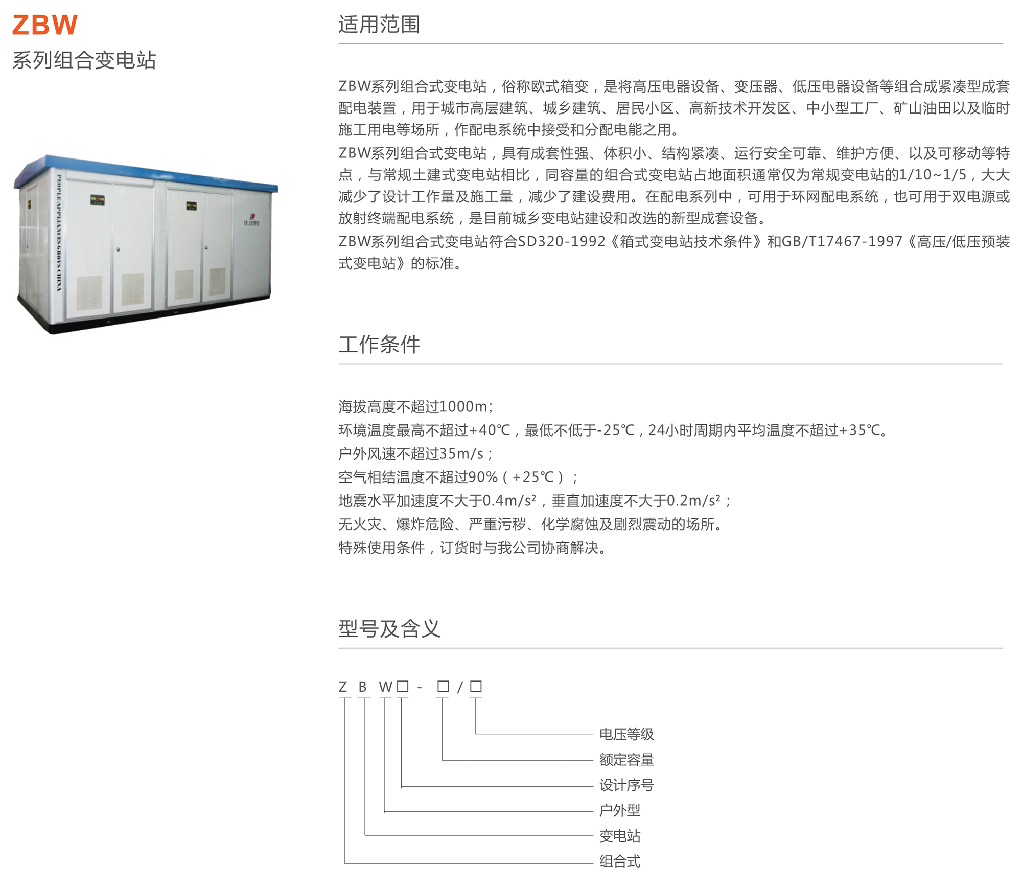 ZBW系列組合式變電站,俗稱歐式箱變,是將高壓電器設(shè)備、變壓器、低壓電器設(shè)備等組合成緊湊型成套配電裝置,用于城市高層建筑、城鄉(xiāng)建筑、居民小區(qū)、高新技術(shù)開發(fā)區(qū)、中小型工廠、礦山油田以及臨時施工用電等場所,作配電系統(tǒng)中接受和分配電能之用。 ZBW系列組合式變電站,具有成套性強、體積小、結(jié)構(gòu)緊湊、運行安全可靠、維護方便、以及可移動等特點,與常規(guī)土建式變電站相比,同容量的組合式變電站占地面積通常僅為常規(guī)變電站的1/10~1/5,大大減少了設(shè)計工作量及施工量,減少了建設(shè)費用。在配電系列中,可用...