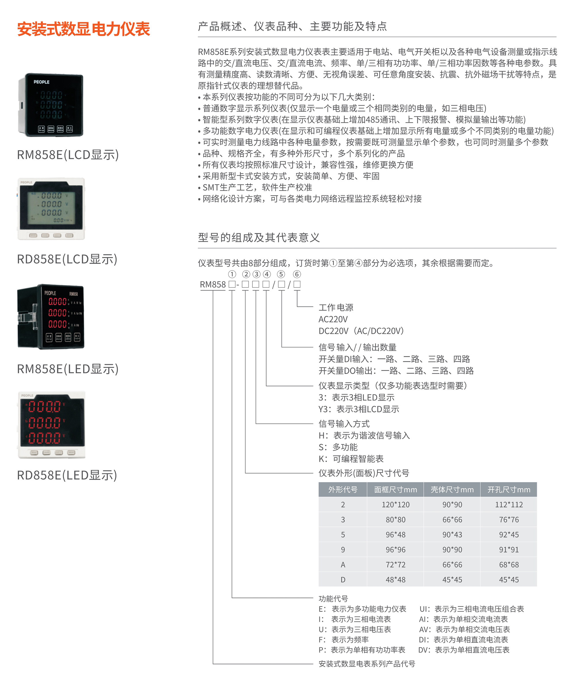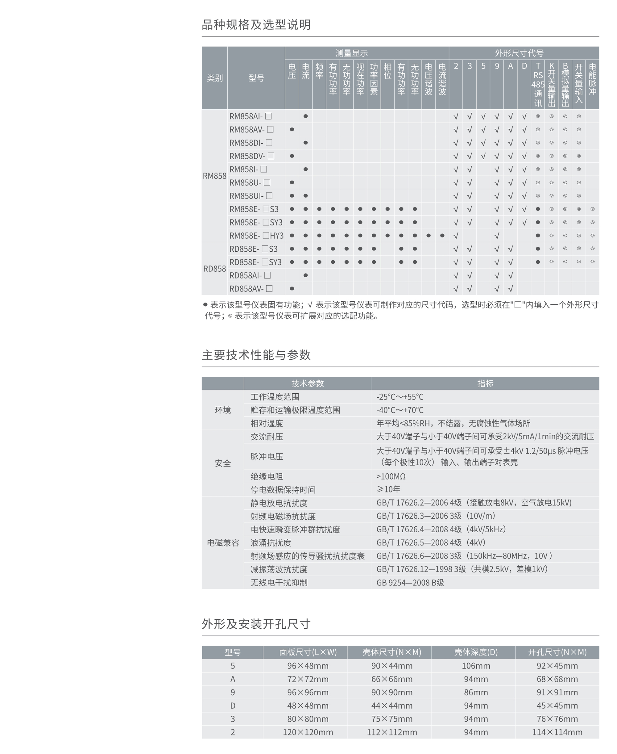 RM858E系列安裝式數(shù)顯電力儀表表主要適用于電站、電氣開關柜以及各種電氣設備測量或指示線路中的交/直流電壓、交/直流電流、頻率、單/三相有功功率、單/三相功率因數(shù)等各種電參數(shù)。具有測量精度高、讀數(shù)清晰、方便、無視角誤差、可任意角度安裝、抗震、抗外磁場干擾等特點,是原指針式儀表的理想替代品。