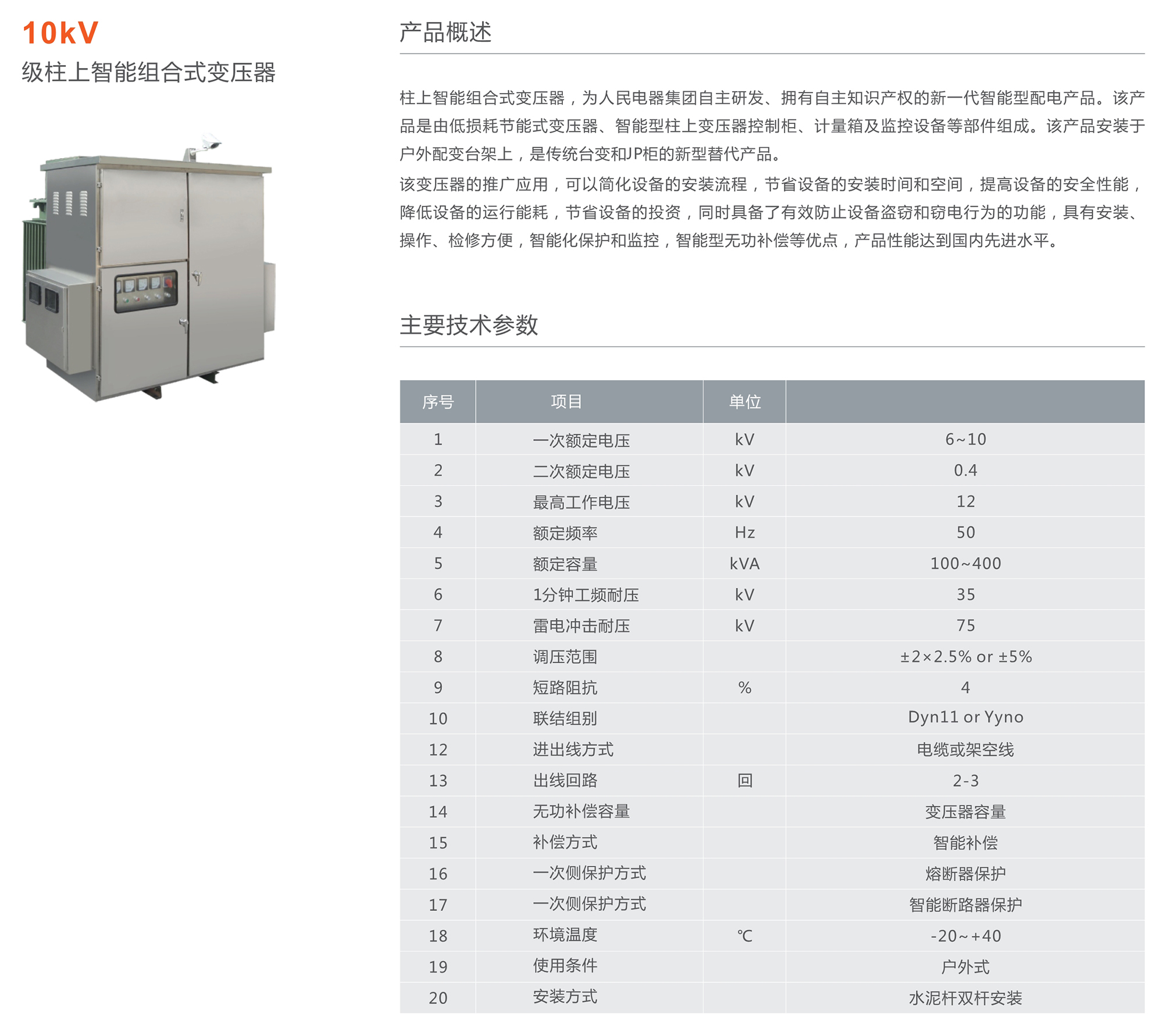 柱上智能組合式變壓器,為人民電器集團(tuán)自主研發(fā)、擁有自主知識(shí)產(chǎn)權(quán)的新一代智能型配電產(chǎn)品。該產(chǎn)品是由低損耗節(jié)能式變壓器、智能型柱上變壓器控制柜、計(jì)量箱及監(jiān)控設(shè)備等部件組成。該產(chǎn)品安裝于戶外配變臺(tái)架上,是傳統(tǒng)臺(tái)變和JP柜的新型替代產(chǎn)品。