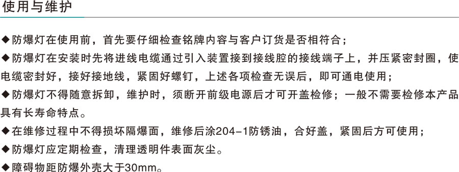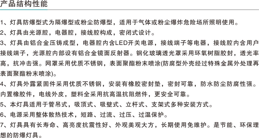 適用于ⅡA、ⅡB、ⅡC類含有爆炸性氣體或蒸汽環(huán)境,溫度組別為T1-T6的1區(qū)、2區(qū)室內(nèi)外危險(xiǎn)場(chǎng)氣或20區(qū)、21區(qū)、22區(qū)爆炸性或可燃性粉塵場(chǎng)所室內(nèi)外照明。