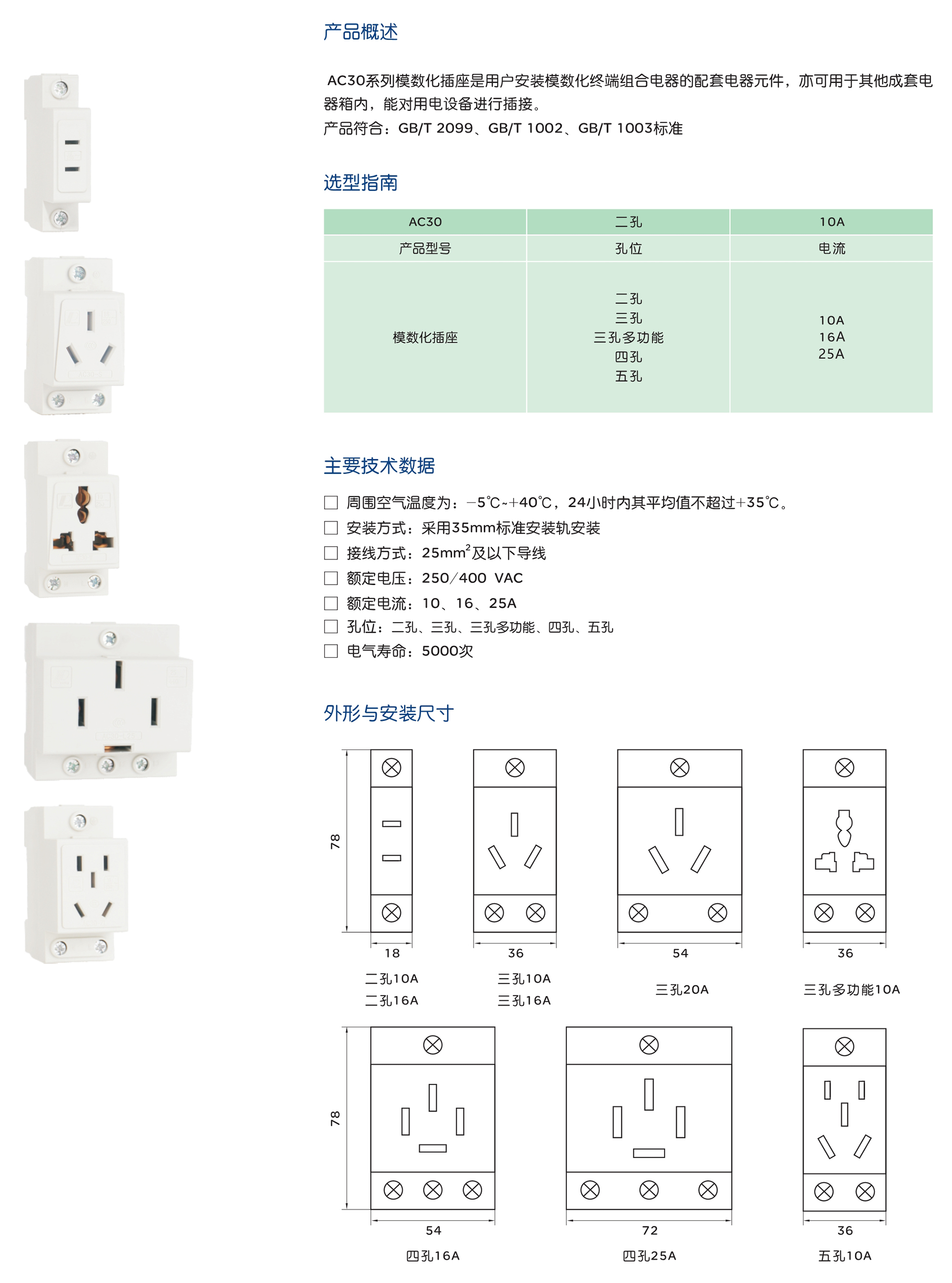 AC30系列模數(shù)化插座是用戶安裝模數(shù)化終端組合電器的配套電器元件,亦可用于其他成套電 器箱內(nèi),能對用電設(shè)備進(jìn)行插接。 產(chǎn)品符合:GB2099/GB1002/GB1003標(biāo)準(zhǔn)
