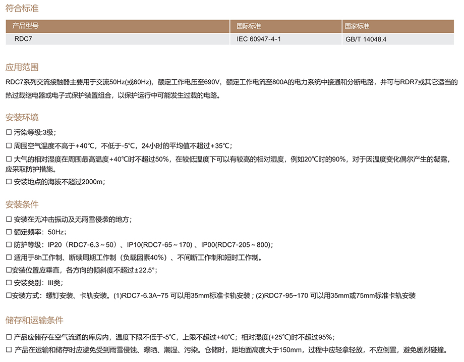 RDC7系列交流接觸器主要用于交流50Hz( 60Hz),額定工作電壓至690V,額定工作電流至800A的電力系統(tǒng)中接通和分斷電路,并可與RDR7或其它 當?shù)臒徇^載繼電器或電子式保護裝置組合,以保護運行中可能發(fā)生過載的電路。