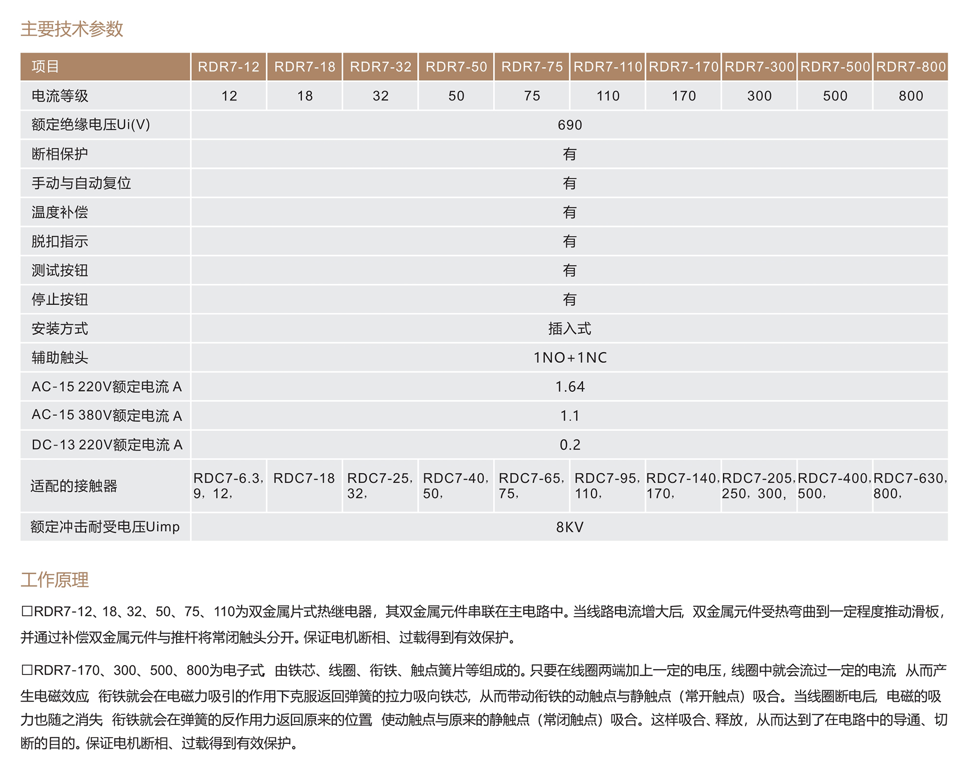 RDR7系列熱繼電器主要用于交流50Hz/60Hz,額定工作電壓至690V,電流0.11A~800A電路中,作電路和電動機的過載和斷相等保護??梢耘cRDC7系列交流接觸器組成起動器。熱繼電器具有斷相保護、溫度補償、整定電流調節(jié)、自動復位和手動復位任意選擇、動作指示信號、安裝面積小、安裝方式多樣等功能和特點,具有測試按鈕和停止按鈕。可進行動作靈活性檢查。有防止手指觸電護罩,使用安全。有閉鎖裝置防止誤操作等。