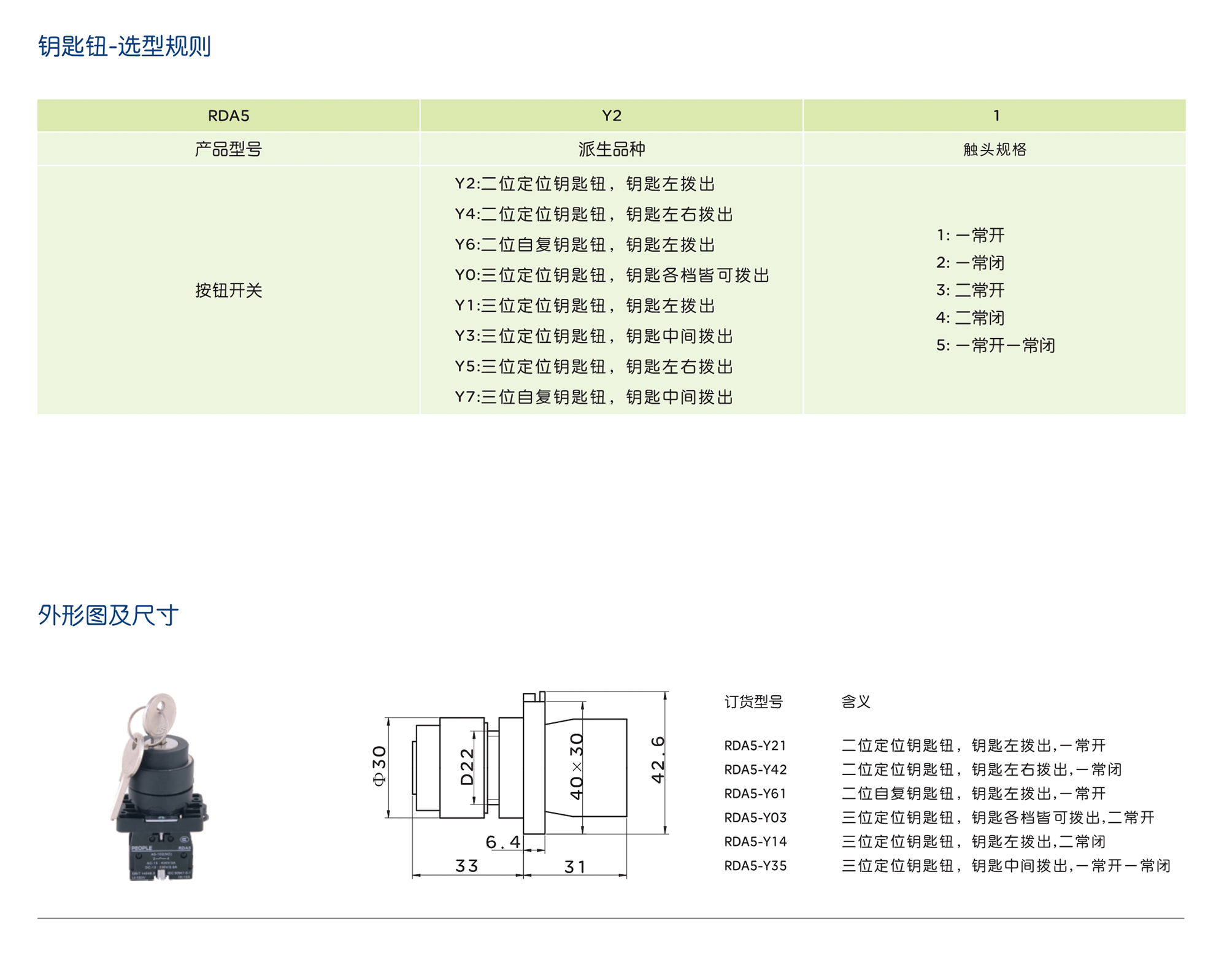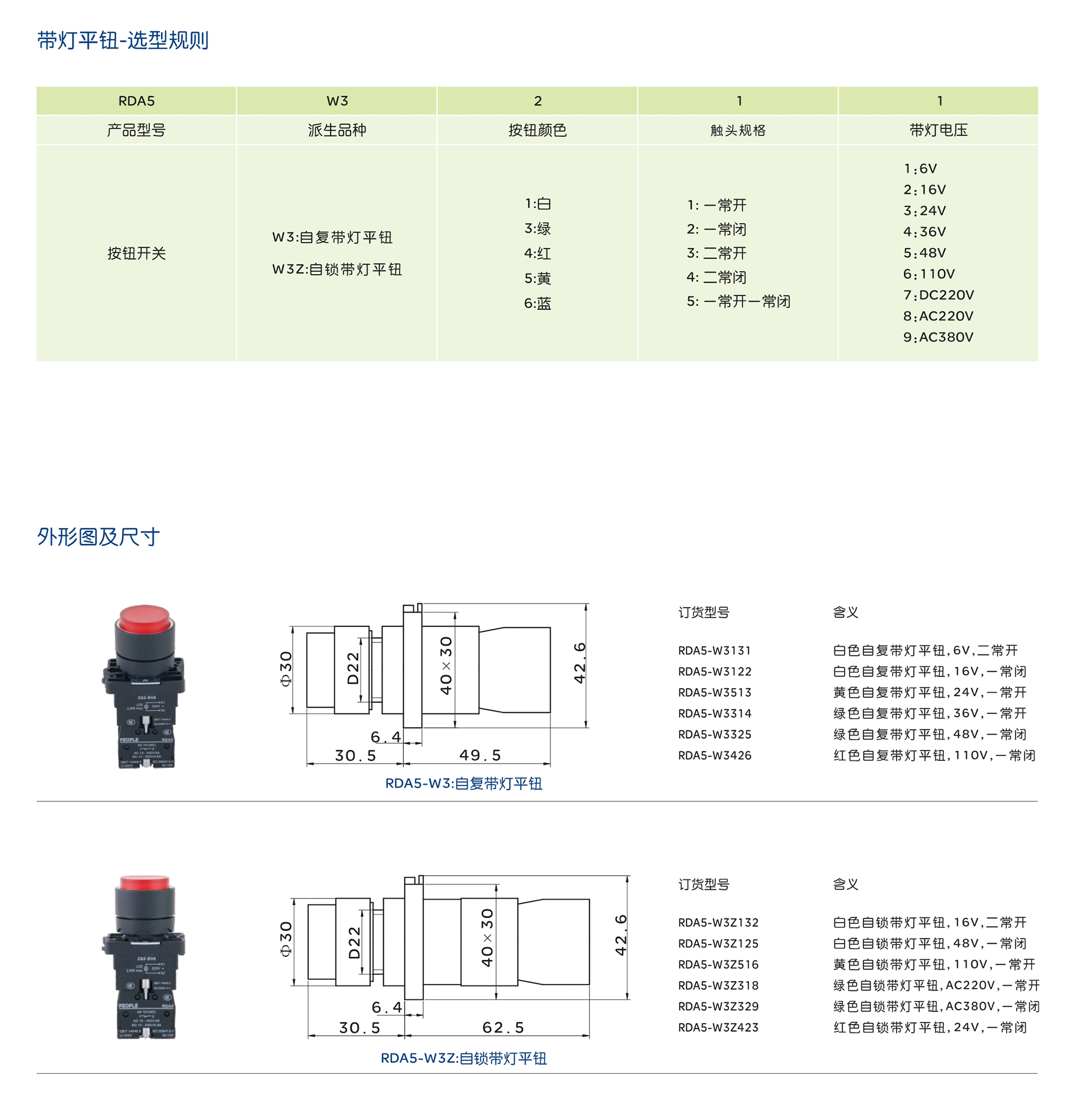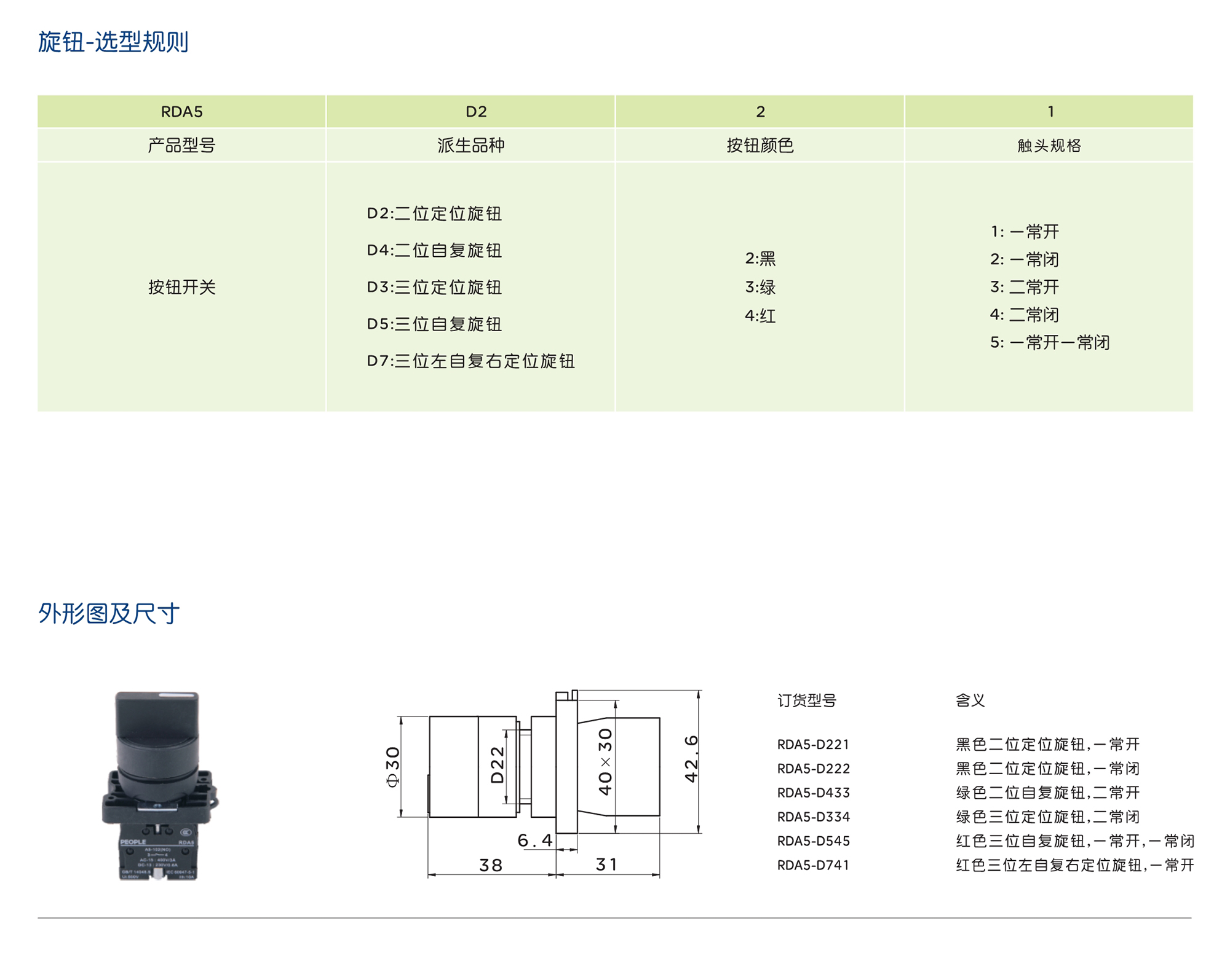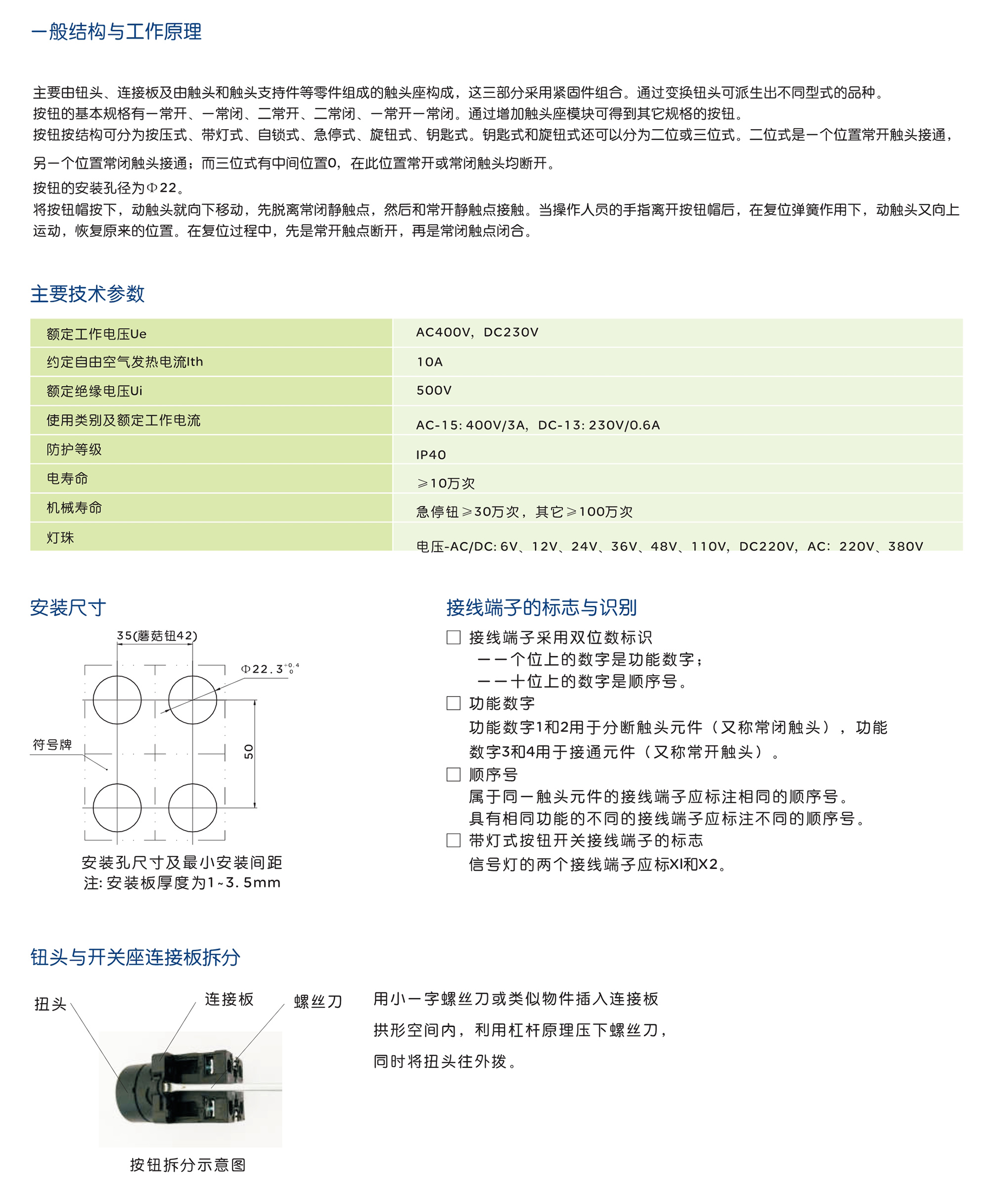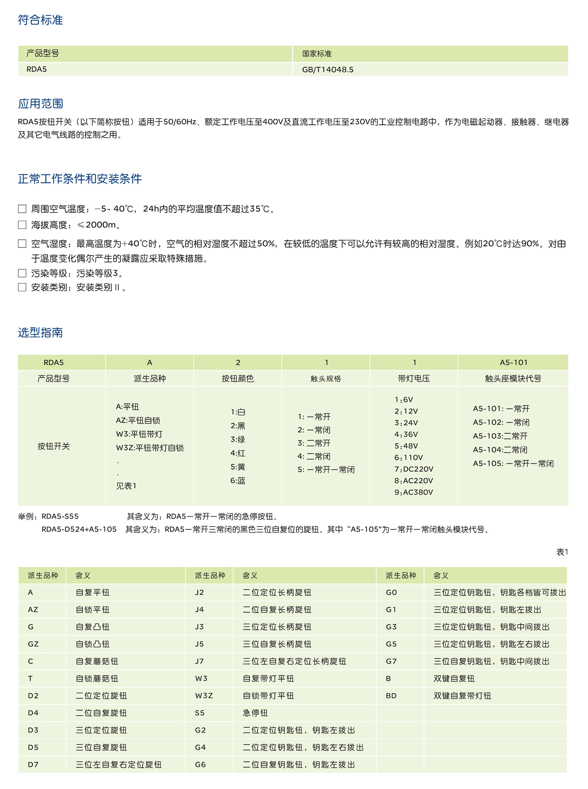 RDA5按鈕開關(guān)(以下簡稱按鈕)適用于5060Hz、額定工作電壓至400V及直流工作電壓至230V的工業(yè)控制電路中,作為電磁起動(dòng)器、接觸器、繼電器及其它電氣線路的控制之用。
