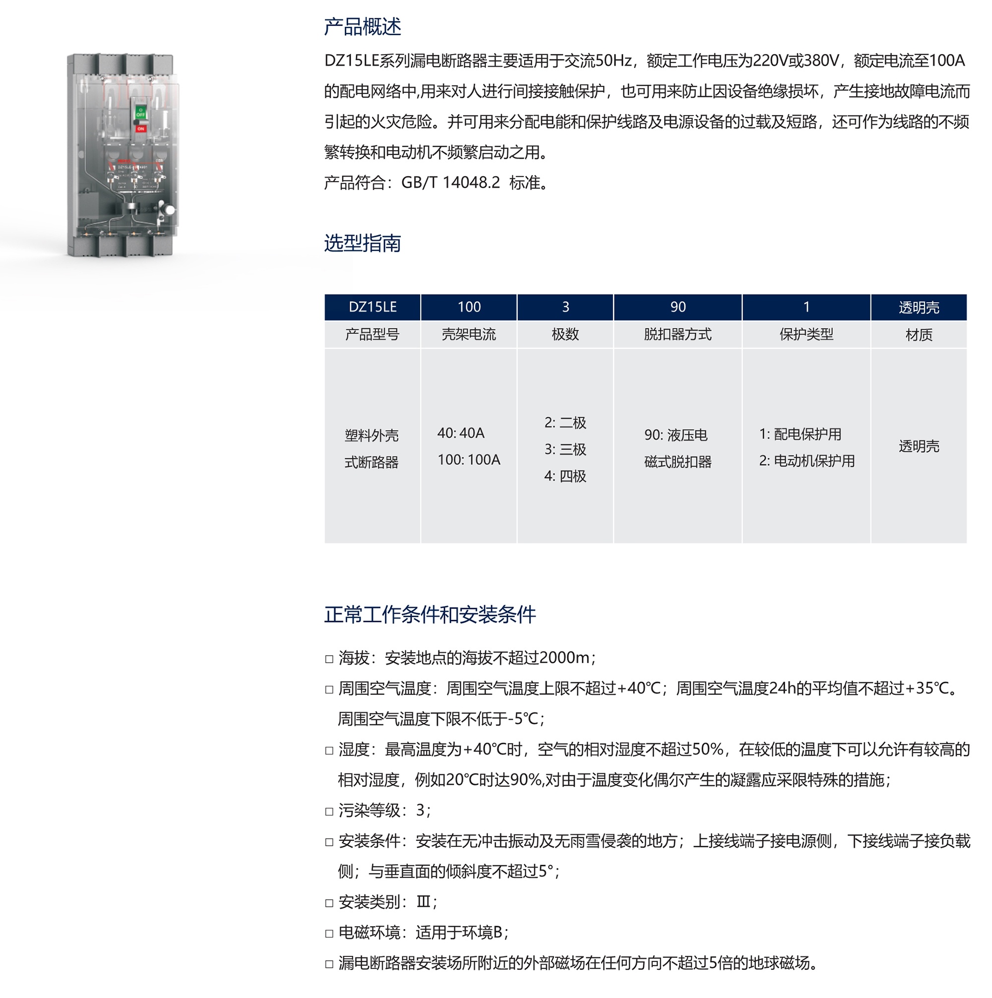 DZ15LE系列漏電斷路器主要適用于交流50Hz,額定工作電壓為220V或380V,額定電流至100A的配電網絡中,用來對人進行間接接觸保護,也可用來防止因設備絕緣損壞,產生接地故障電流而引起的火災危險。并可用來分配電能和保護線路及電源設備的過載及短路,還可作為線路的不頻繁轉換和電動機不頻繁啟動之用。 產品符合:GB/T 14048.2 標準。