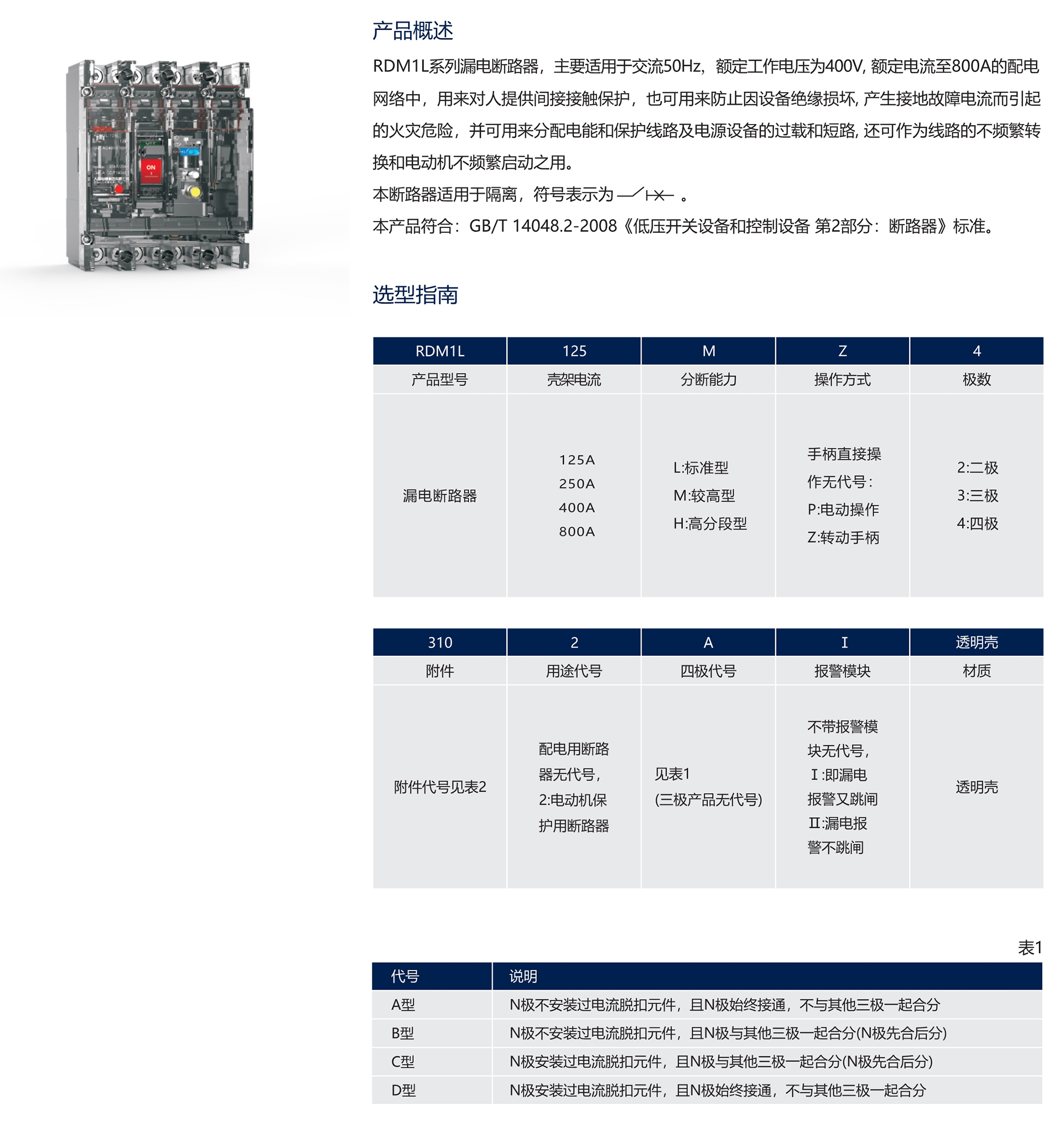 RDM1L系列漏電斷路器,主要適用于交流50Hz,額定工作電壓為400V, 額定電流至800A的配電網(wǎng)絡中,用來對人提供間接接觸保護,也可用來防止因設備絕緣損壞, 產(chǎn)生接地故障電流而引起的火災危險,并可用來分配電能和保護線路及電源設備的過載和短路, 還可作為線路的不頻繁轉換和電動機不頻繁啟動之用。