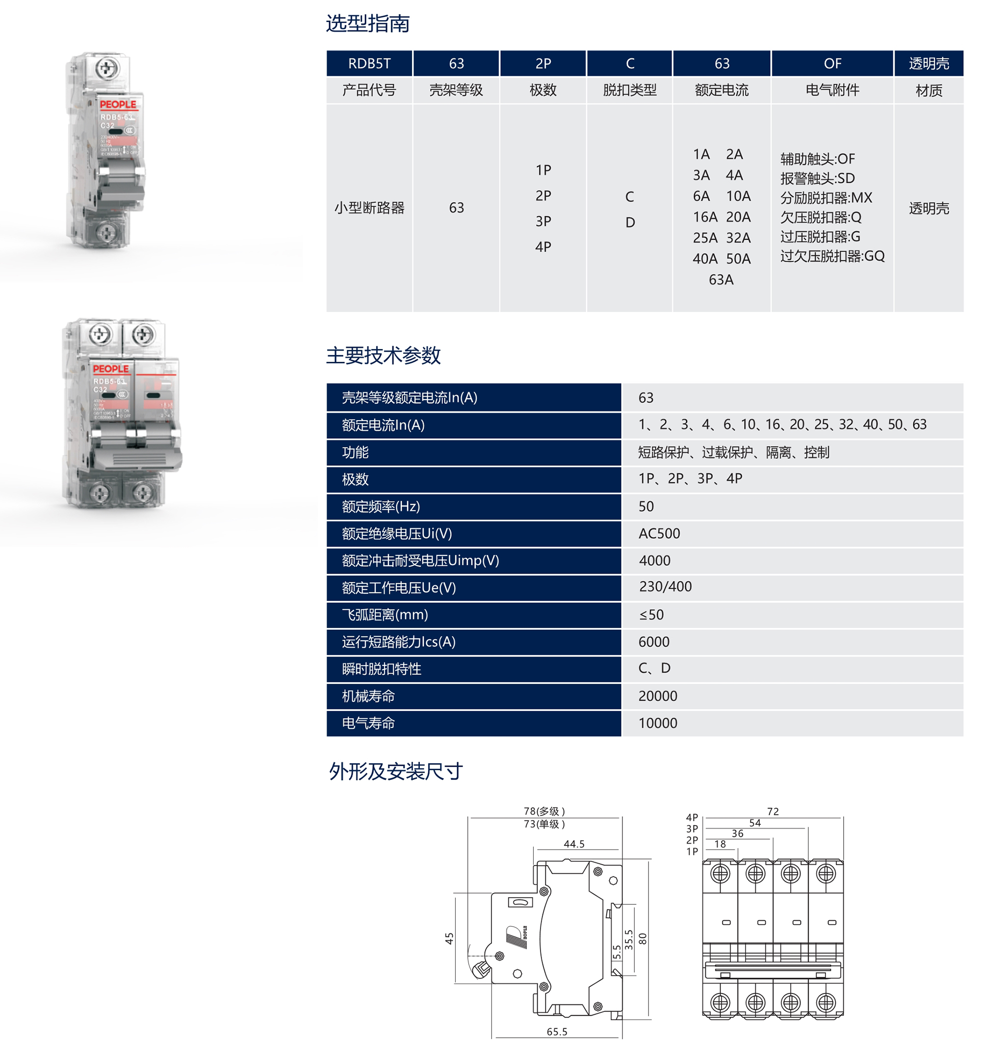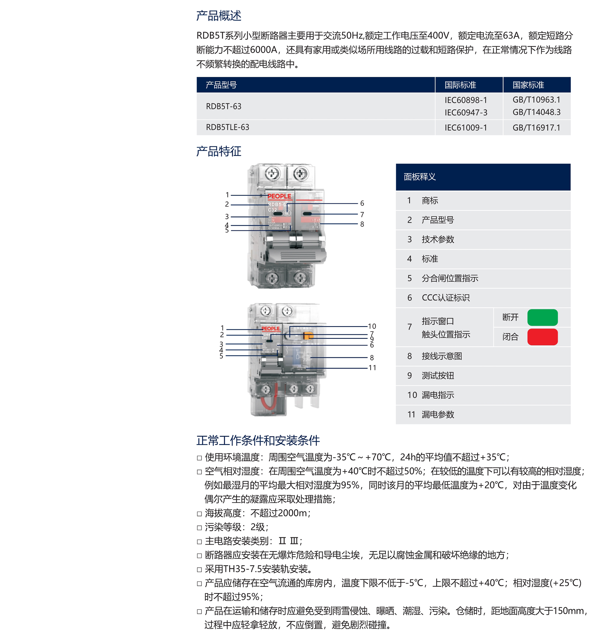 RDB5T系列小型斷路器主要用于交流50Hz,額定工作電壓至400V,額定電流至63A,額定短路分斷能力不超過6000A,還具有家用或類似場所用線路的過載和短路保護,在正常情況下作為線路不頻繁轉(zhuǎn)換的配電線路中。