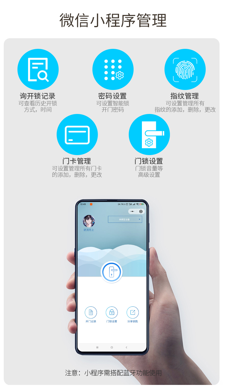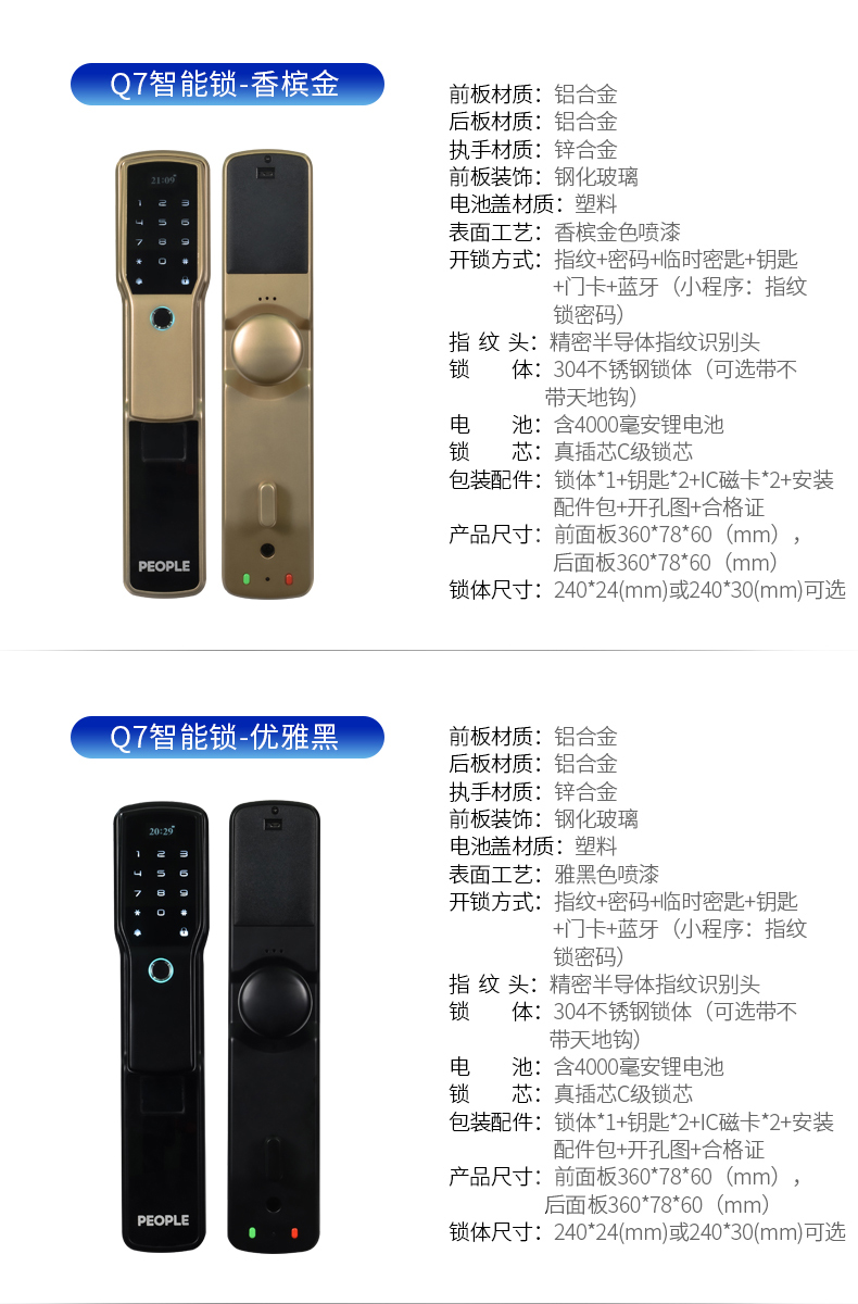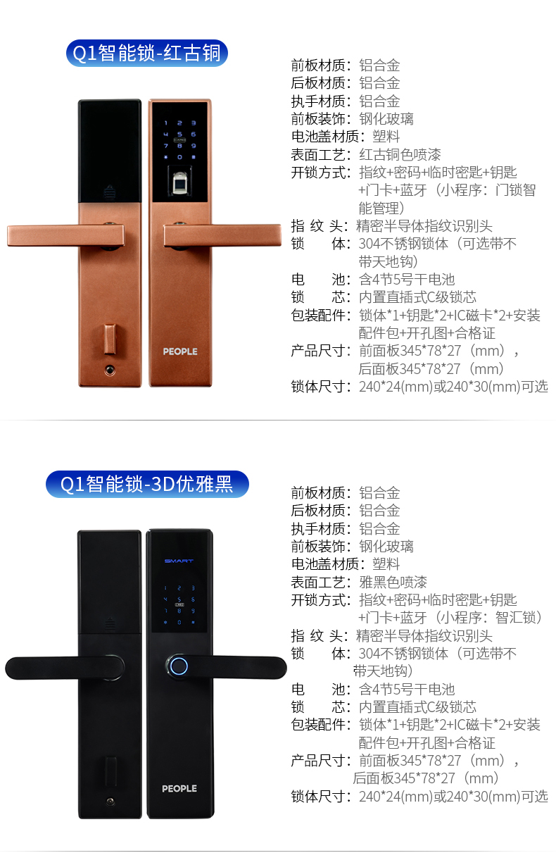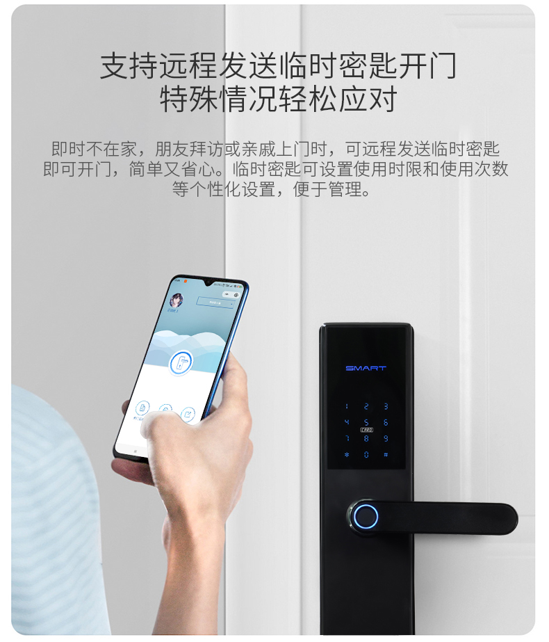 鋁合金多功能指紋智能鎖,開鎖方式有指紋+密碼H臨時(shí)密匙+鑰匙+門卡+藍(lán)牙(小程序: 指紋鎖密碼)