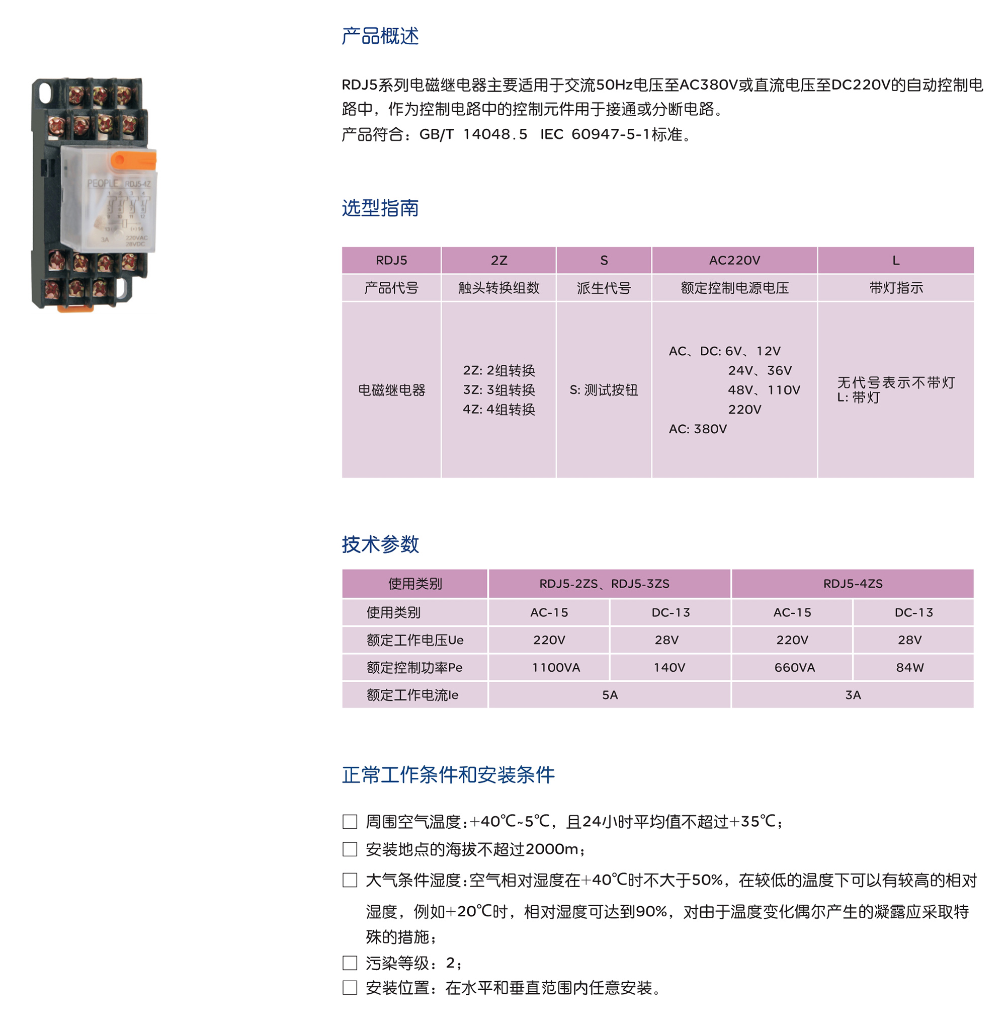 RDJ5系列電磁繼電器主要適用于交流50Hz電壓至AC380V或直流電壓至DC220V的自動控制電 路中,作為控制電路中的控制元件用于接通或分斷電路。 產(chǎn)品符合:GB/T 14048.5 IEC 60947-5-1標準。