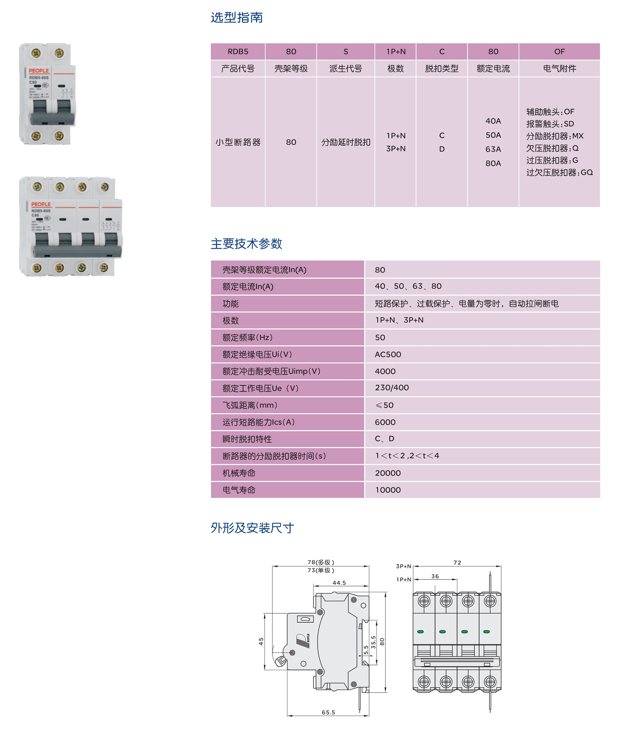 RDB5-80S小型斷路器(以下簡稱斷路器),主要用于交流50Hz,額定工作電壓230/400V,額定電流至80A,額定短路分?jǐn)嗄芰Σ怀^6000A的保護(hù)配電線路中,主要與單相/三相IC卡電能表配套使用,進(jìn)行遠(yuǎn)距離欠費(fèi)自動(dòng)分閘,同時(shí)對(duì)線路起過載和短路保護(hù)的作用,也可作為線路的不頻繁接通、分?jǐn)嗪娃D(zhuǎn)換之用。