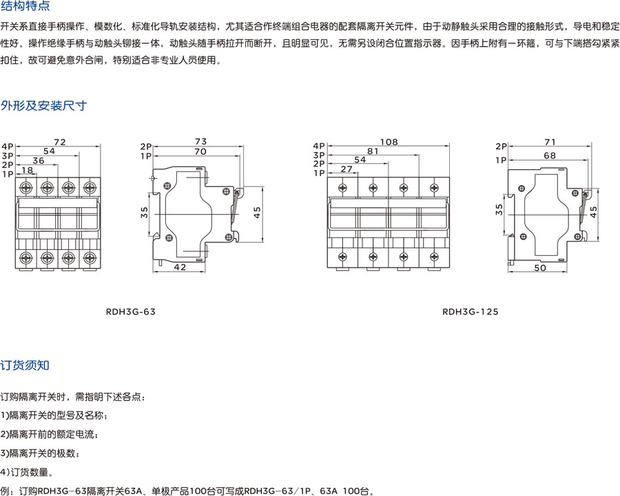 RDH3G系列隔離開關(guān)主要適用于交流50/60Hz、額定電壓230V/400V、額定電流至125A的電路中,用于通斷電阻性負(fù)載,包括適當(dāng)過負(fù)載,作線路與電源隔離之用。尤其適合線路檢修時(shí)有效隔離電源并防止意外合閘,以確保檢修人員的操作安全。