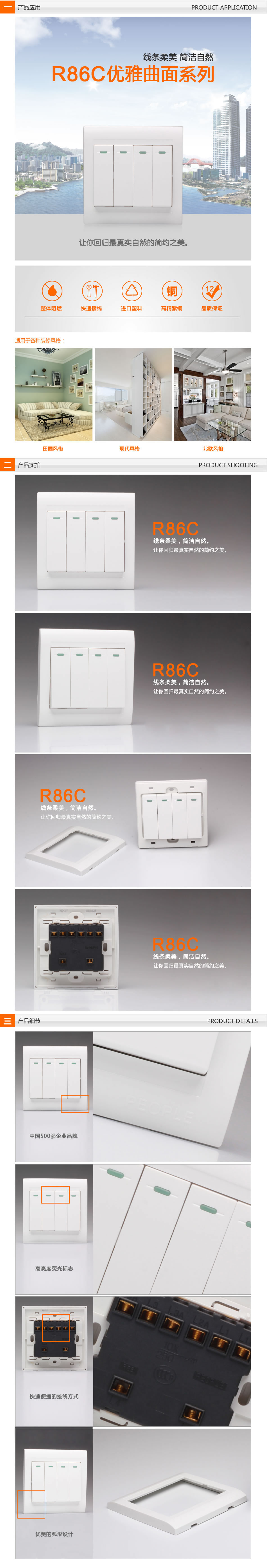 型號:R86C-4K1(單控)、R86C-4K2(雙控) 四聯(lián)開關(guān);顏色:乳白