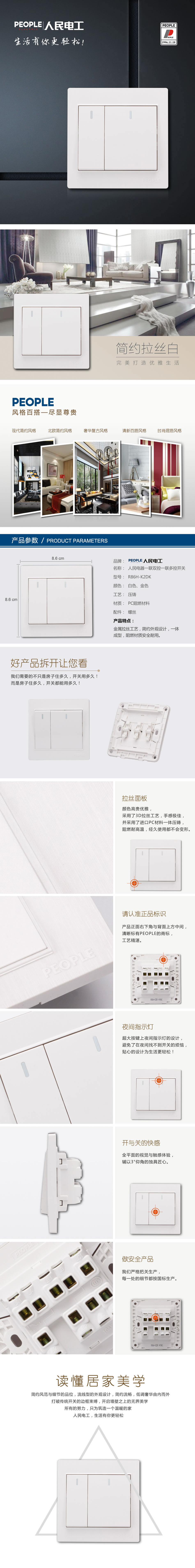 型號:R86H-K2DK 一聯(lián)雙控、一聯(lián)多控開關(guān);顏色:白色、金色