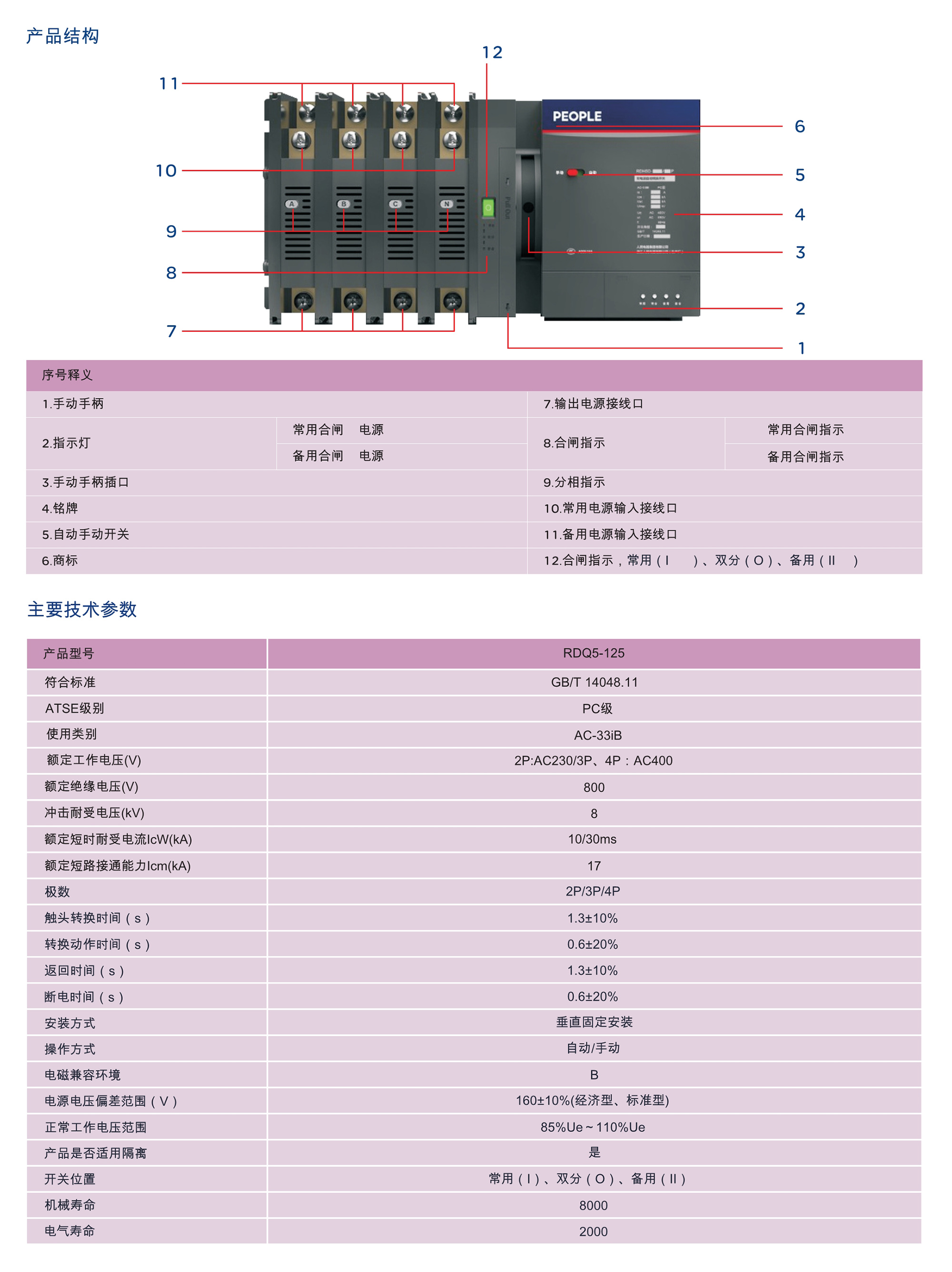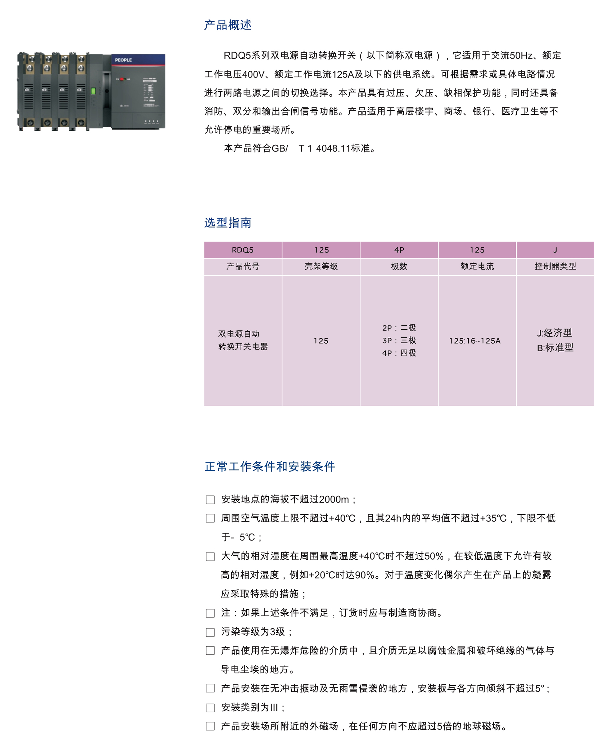 RDQ5系列雙電源自動轉換開關(以下簡稱雙電源),它適用于交流50Hz、額定工作電壓400V、額定工作電流125A及以下的供電系統(tǒng)。可根據(jù)需求或具體電路情況進行兩路電源之間的切換選擇。本產(chǎn)品具有過壓、欠壓、缺相保護功能,同時還具備消防、雙分和輸出合閘信號功能。產(chǎn)品適用于高層樓宇、商場、銀行、醫(yī)療衛(wèi)生等不允許停電的重要場所。