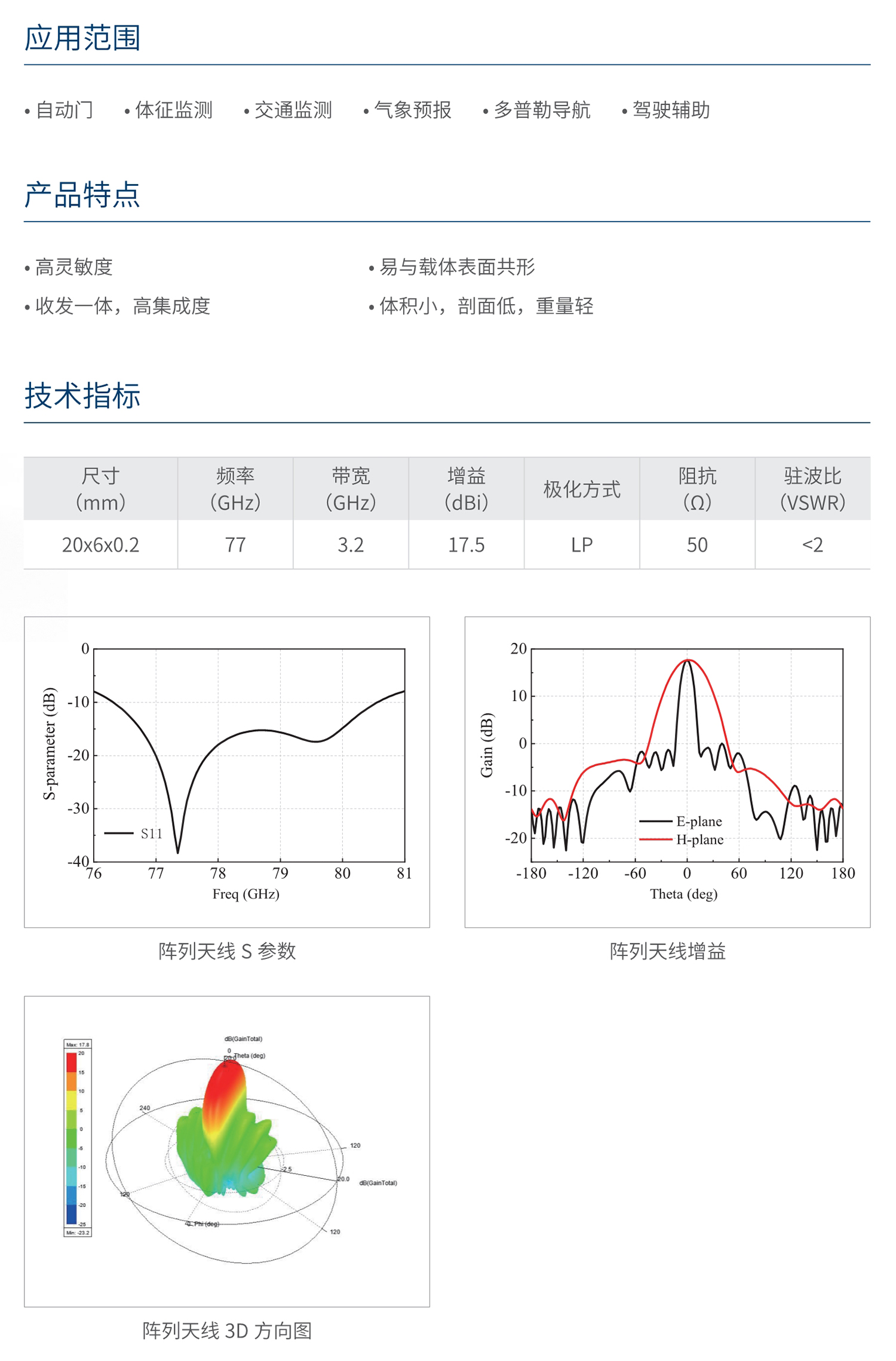 首頁 > 產(chǎn)品中心 > 通信產(chǎn)品 > 天線 > 2x14 梳狀微帶天線(77GHz)