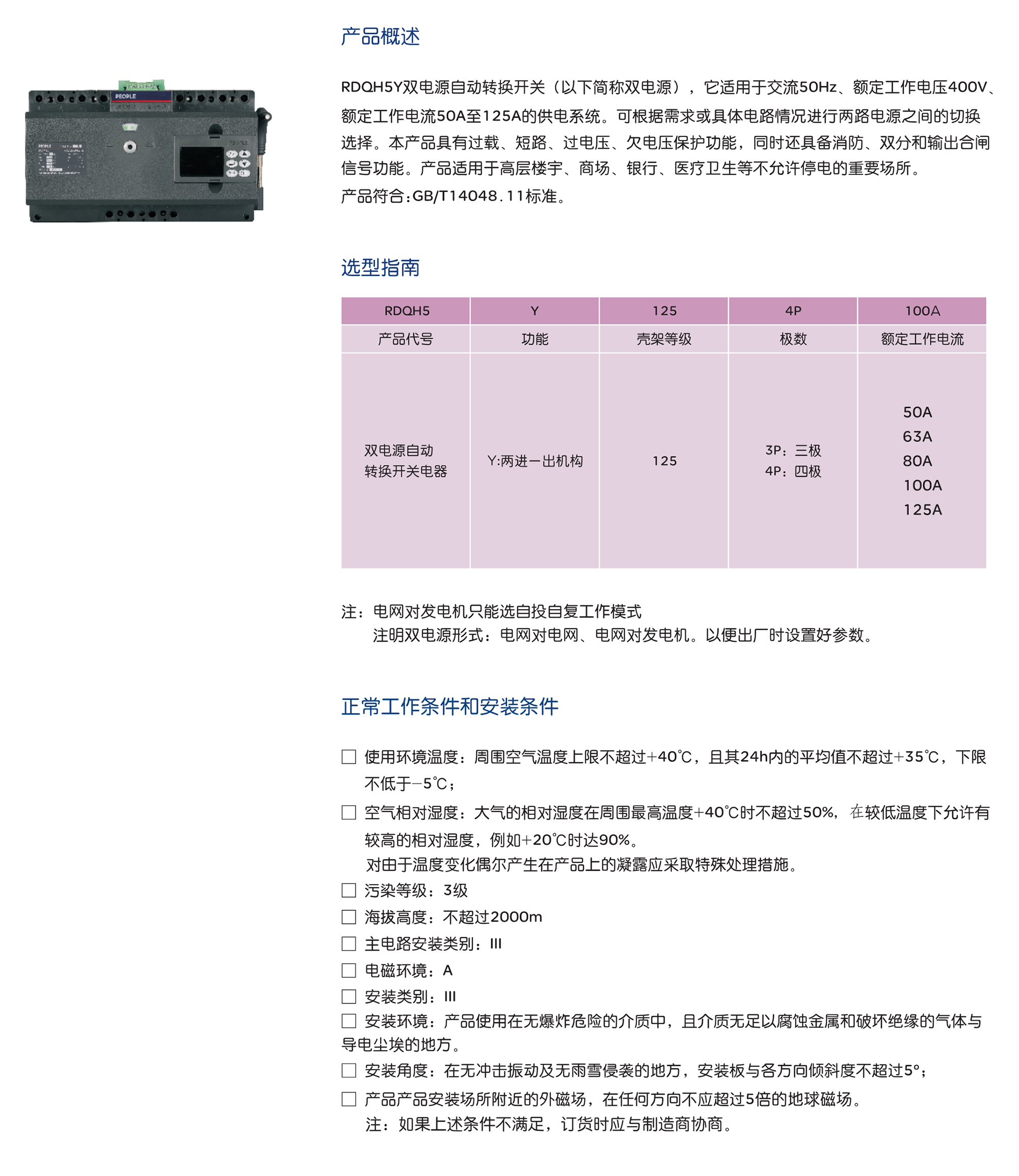 RDQH5Y雙電源自動(dòng)轉(zhuǎn)換開關(guān)(以下簡(jiǎn)稱雙電源),它適用于交流50Hz、額定工作電壓400V、額定工作電流50A至125A的供電系統(tǒng)??筛鶕?jù)需求或具體電路情況進(jìn)行兩路電源之間的切換選擇。本產(chǎn)品具有過(guò)載、短路、過(guò)電壓、欠電壓保護(hù)功能,同時(shí)還具備消防、雙分和輸出合閘信號(hào)功能。產(chǎn)品適用于高層樓宇、商場(chǎng)、銀行、醫(yī)療衛(wèi)生等不允許停電的重要場(chǎng)所。