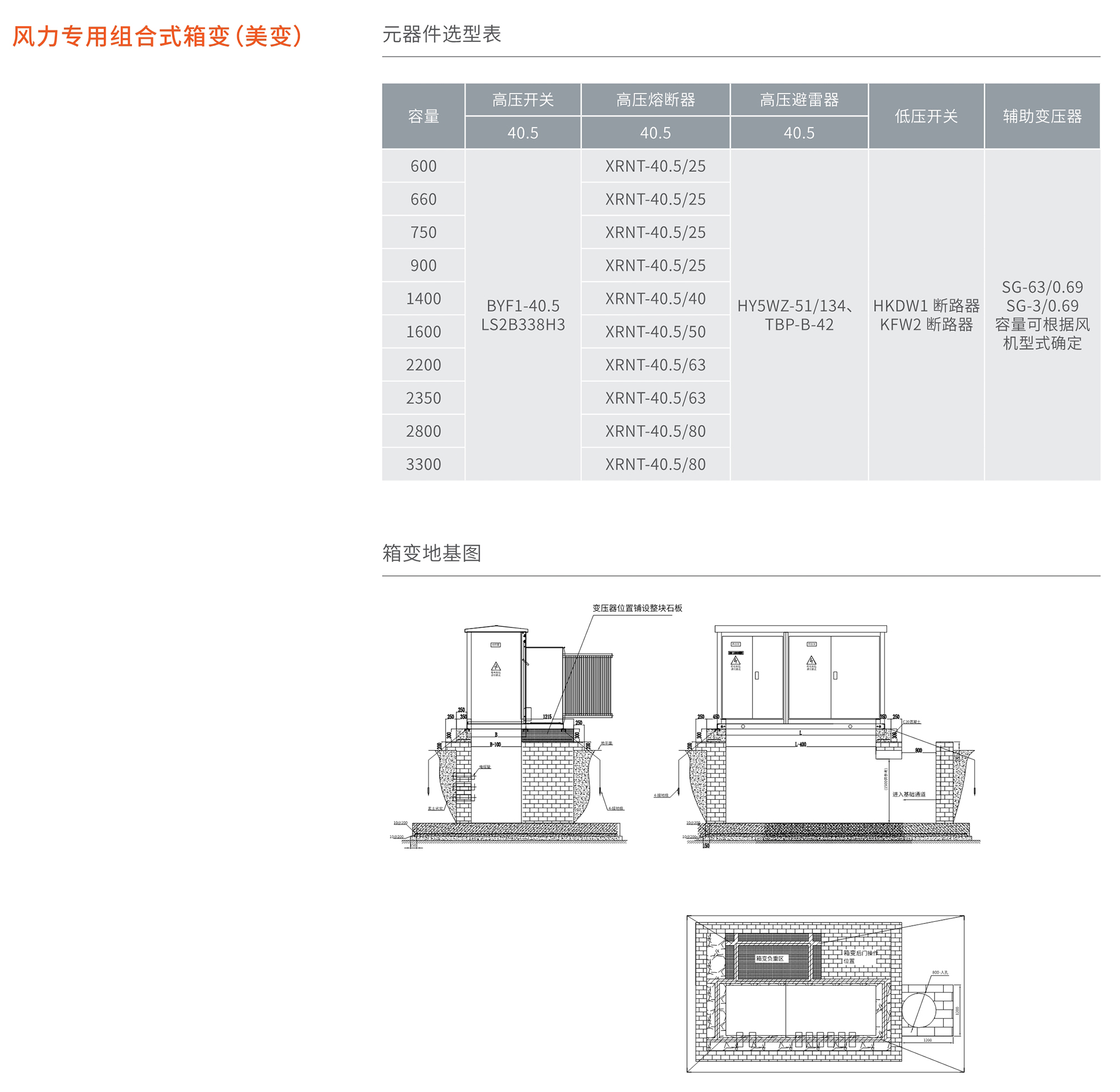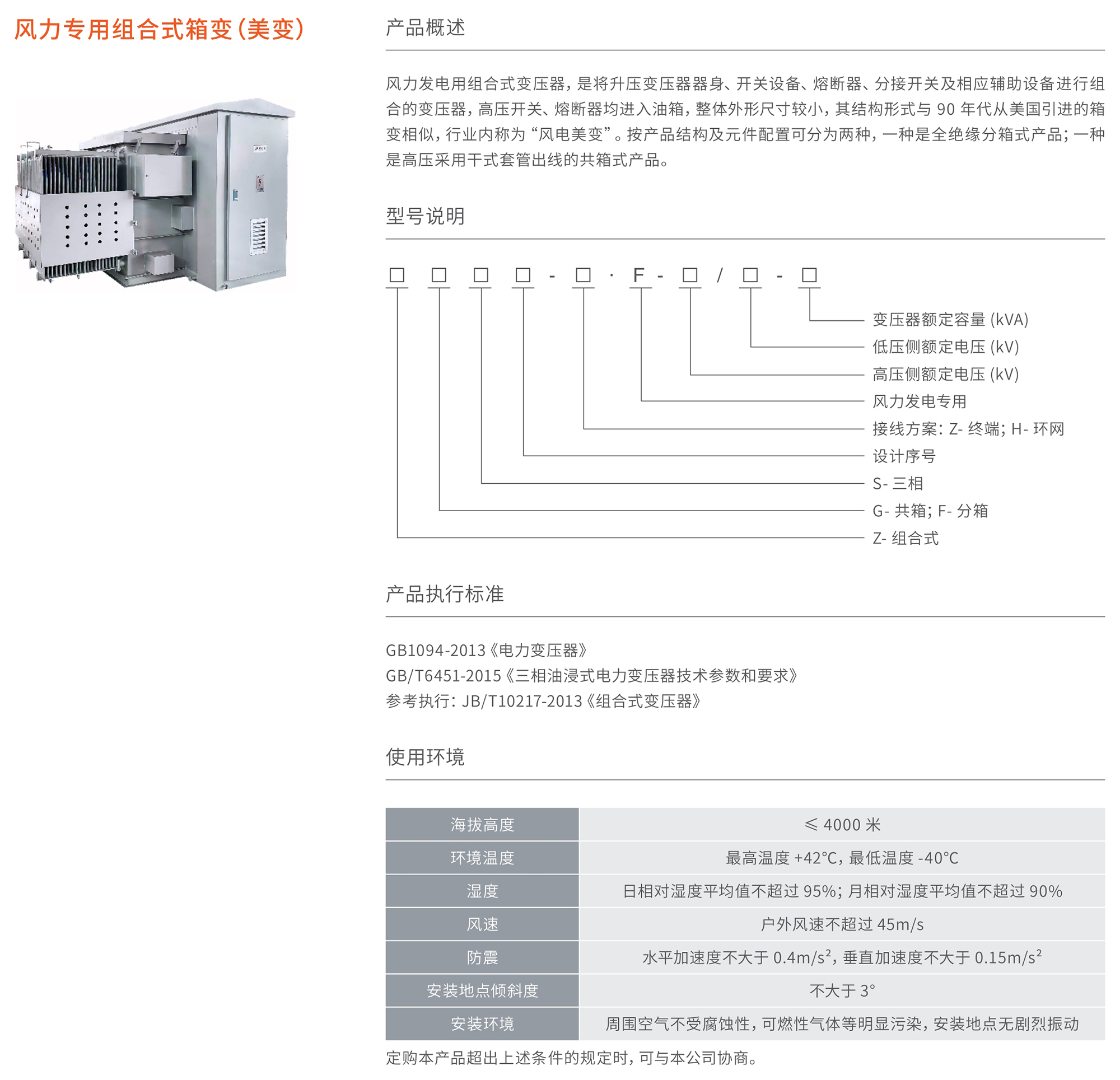 風(fēng)力發(fā)電用組合式變壓器,是將升壓變壓器器身、開關(guān)設(shè)備、熔斷器、分接開關(guān)及相應(yīng)輔助設(shè)備進行組合的變壓器,高壓開關(guān)、熔斷器均進入油箱,整體外形尺寸較小,其結(jié)構(gòu)形式與90年代從美國引進的箱變相似,行業(yè)內(nèi)稱為“風(fēng)電美變”。按產(chǎn)品結(jié)構(gòu)及元件配置可分為兩種,一種是全絕緣分箱式產(chǎn)品;一種是高壓采用干式套管出線的共箱式產(chǎn)品。