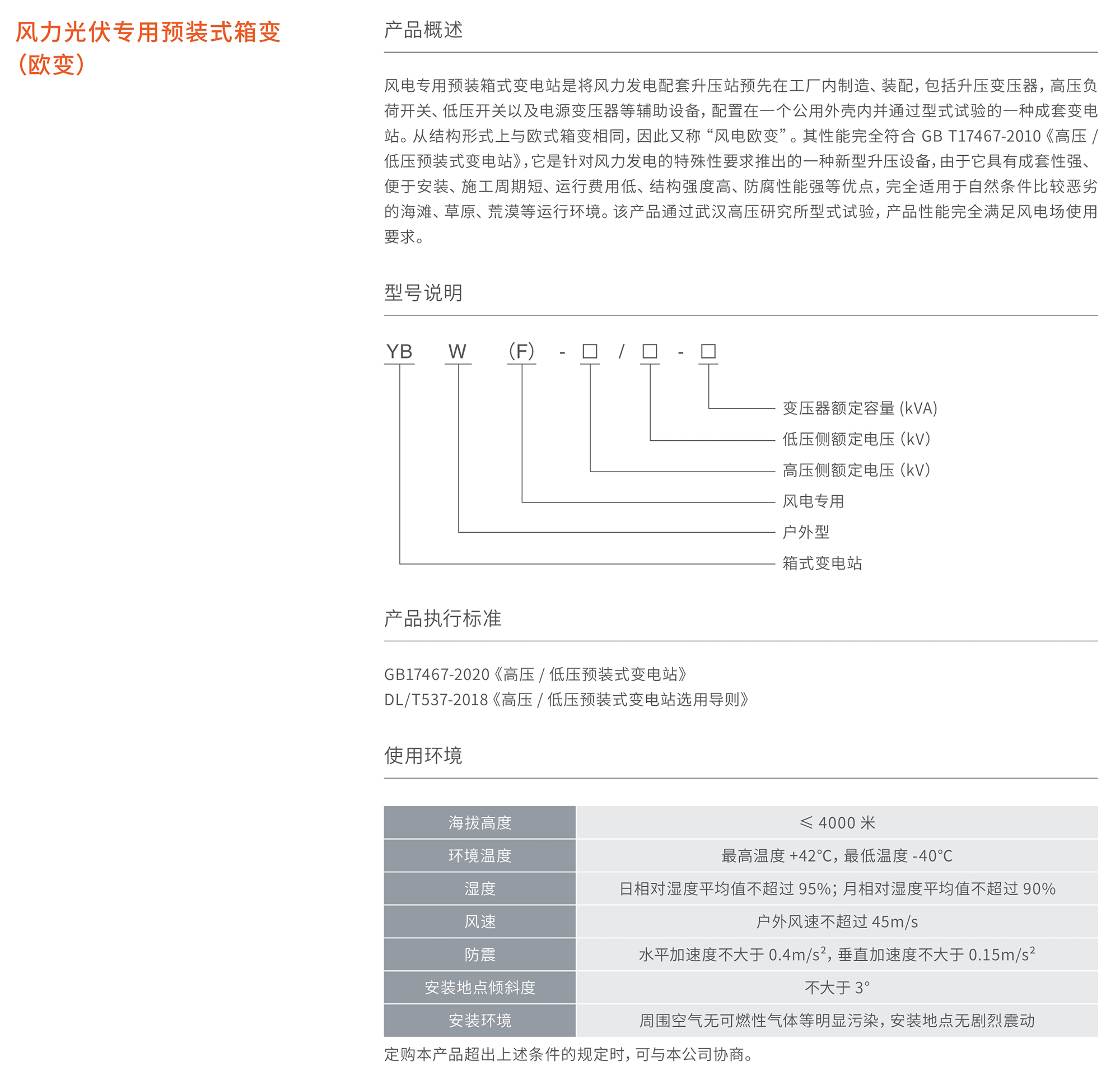 風(fēng)電專用預(yù)裝箱式變電站是將風(fēng)力發(fā)電配套升壓站預(yù)先在工廠內(nèi)制造、裝配,包括升壓變壓器,高壓負(fù)荷開關(guān)、低壓開關(guān)以及電源變壓器等輔助設(shè)備,配置在一個(gè)公用外殼內(nèi)并通過型式試驗(yàn)的一種成套變電站。從結(jié)構(gòu)形式上與歐式箱變相同,因此又稱“風(fēng)電歐變”。其性能完全符合GBT17467-2010《高壓/低壓預(yù)裝式變電站》它是針對(duì)風(fēng)力發(fā)電的特殊性要求推出的一種新型升壓設(shè)備,由于它具有成套性強(qiáng)、便于安裝、施工周期短、運(yùn)行費(fèi)用低、結(jié)構(gòu)強(qiáng)度高、防腐性能強(qiáng)等優(yōu)點(diǎn),完全適用于自然條件比較惡劣的海灘、草原、荒漠等運(yùn)行環(huán)境...