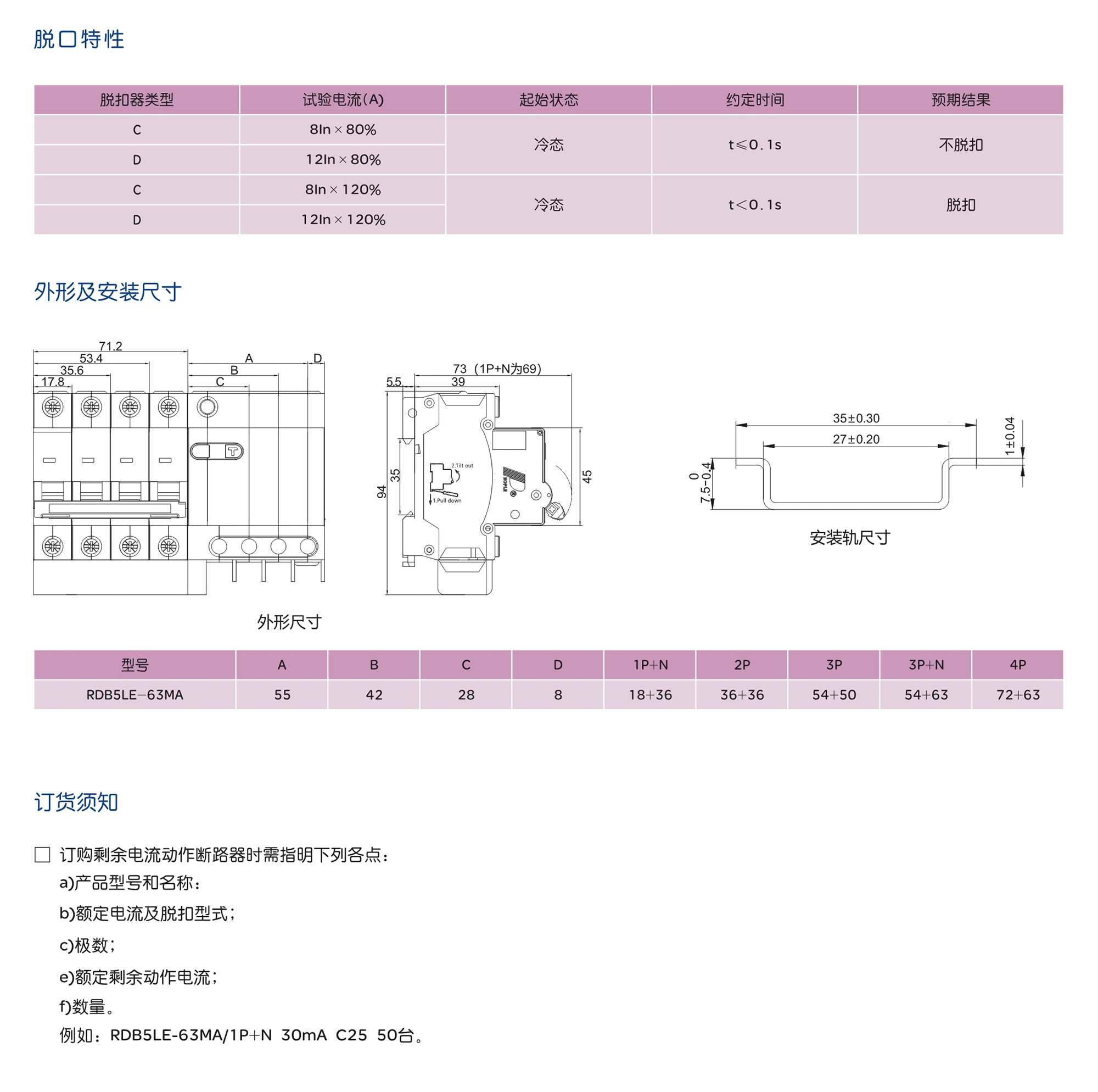 RDB5LE-63MA系列剩余電流動(dòng)作斷路器(下稱(chēng)漏電斷路器)適用于交流50Hz、額定電壓230/400V,額定電流63A的線路。額定短路分?jǐn)嗄芰Σ怀^(guò)6000A的保護(hù)配電線路中,作為線路不頻繁接通、分?jǐn)嗪娃D(zhuǎn)換之用,此系列斷路器僅有漏電、短路保護(hù)功能,無(wú)過(guò)載保護(hù)功能。同時(shí)具有強(qiáng)大的輔助功能模塊,如輔助觸點(diǎn)、帶報(bào)警指示觸點(diǎn)、分勵(lì)脫扣器、欠壓脫扣器、遠(yuǎn)程脫扣控制等模塊。   產(chǎn)品符合:GB/T 14048.2標(biāo)準(zhǔn)。