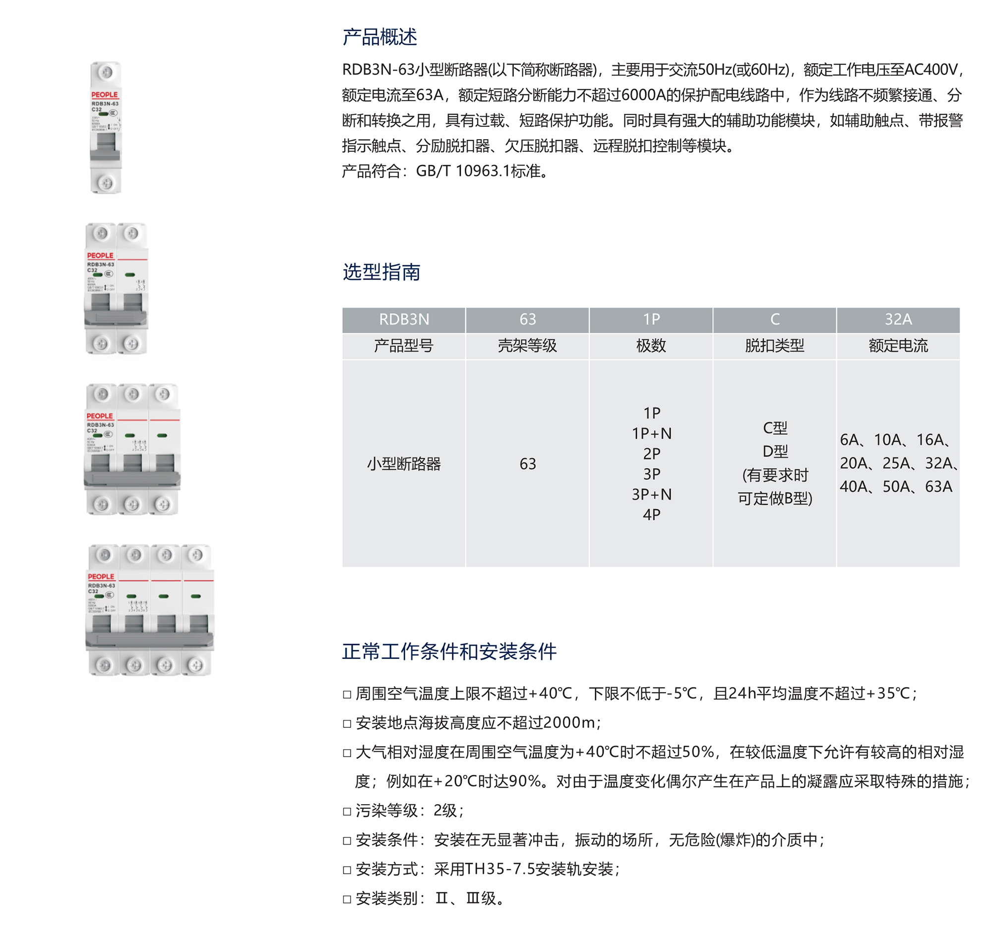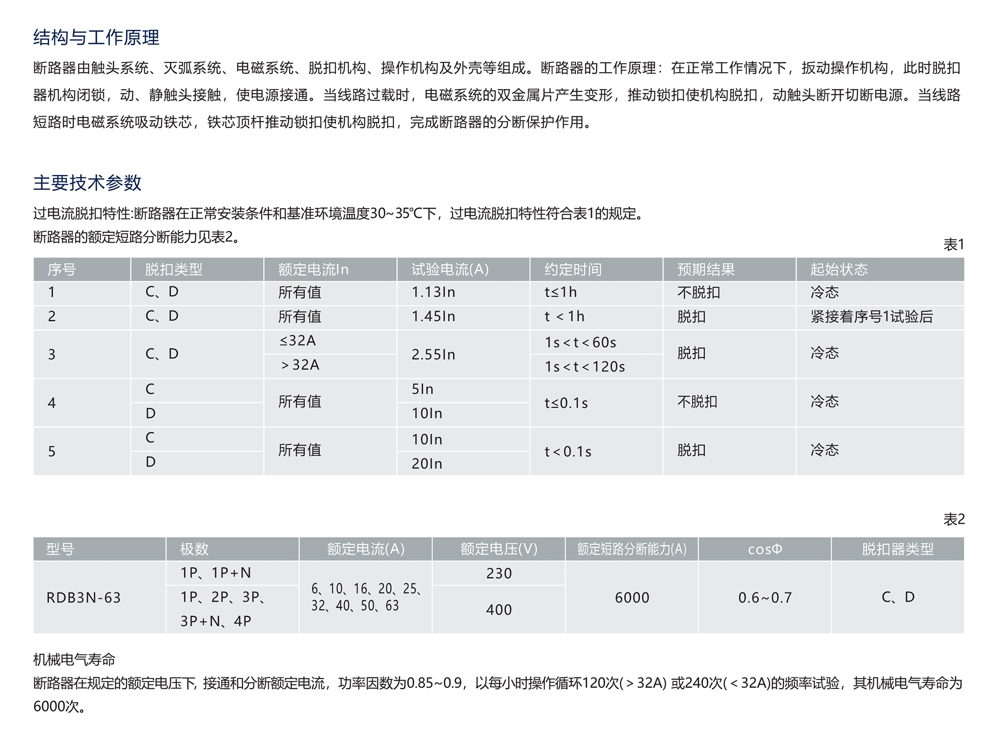 RDB3N-63小型斷路器(以下簡(jiǎn)稱斷路器),主要用于交流50Hz(或60Hz) 額定工作電壓至AC400V額定電流至63A 額定短路分?jǐn)嗄芰Σ怀^6000A的保護(hù)配電線路中,作為線路不頻繁接通、分?jǐn)嗪娃D(zhuǎn)換之用,具有過載、短路保護(hù)功能。同時(shí)具有強(qiáng)大的輔助功能模塊,如輔助觸點(diǎn)、帶報(bào)警指示觸點(diǎn)、分勵(lì)脫扣器、欠壓脫扣器、遠(yuǎn)程脫扣控制等模塊。
