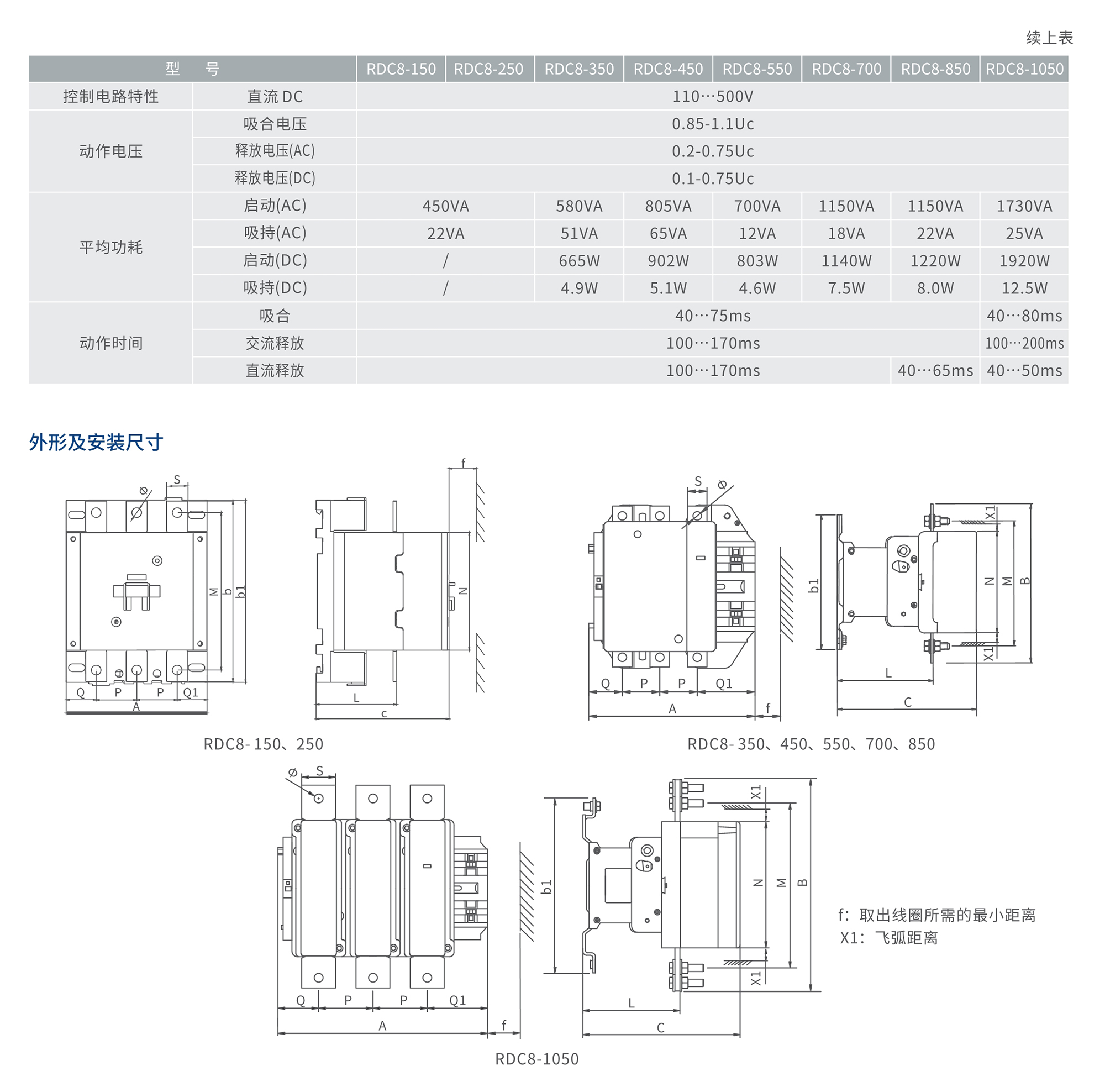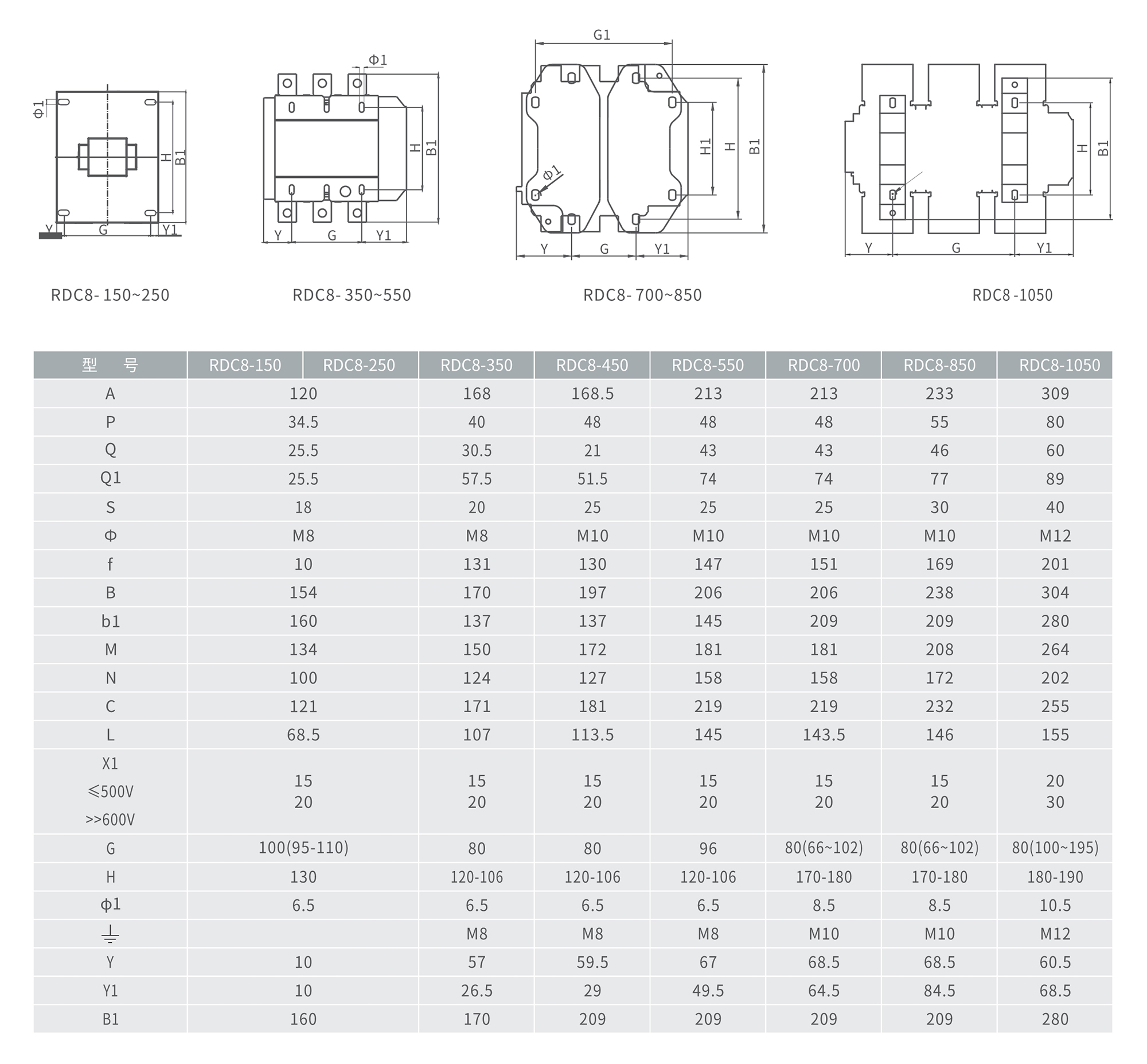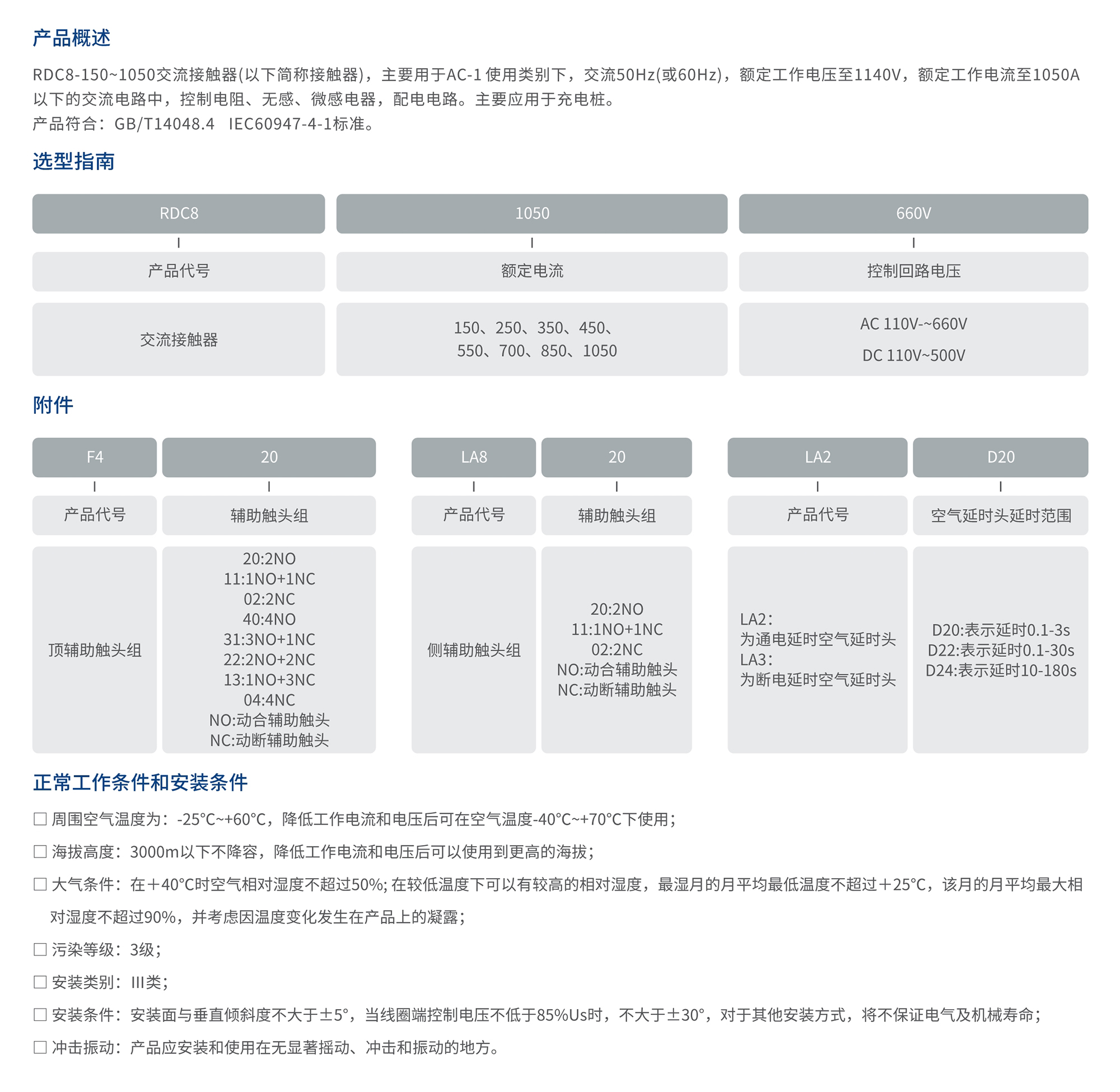 RDC8-150~1050交流接觸器(以下簡(jiǎn)稱(chēng)接觸器),主要用于AC-1使用類(lèi)別下,交流50HZ(或60HZ),額定工作電壓至1140V,額定工作電流至1050A以下的交流電路中,控制電阻、無(wú)感、微感電器,配電電路。主要應(yīng)用于充電樁。
