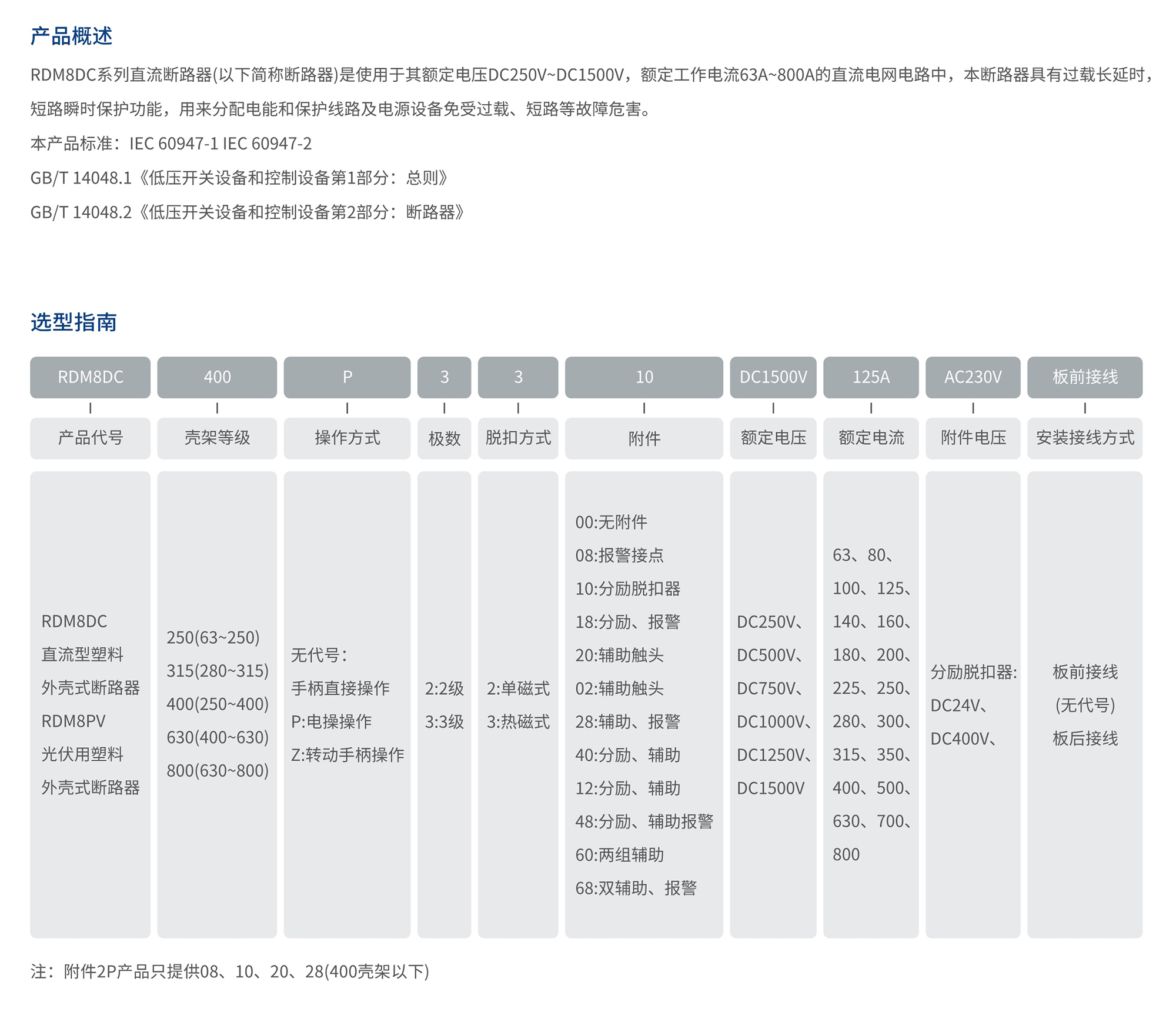 RDM8DC系列直流斷路器(以下簡(jiǎn)稱(chēng)斷路器)是使用于其額定電壓DC250V~DC1500V,額定工作電流63A~800A直流電網(wǎng)電路中,本斷路器具有過(guò)載延時(shí),短路瞬時(shí)保護(hù)功能,用來(lái)分配電能和保護(hù)線路及電源設(shè)備免受過(guò)載、短路等故障危害。