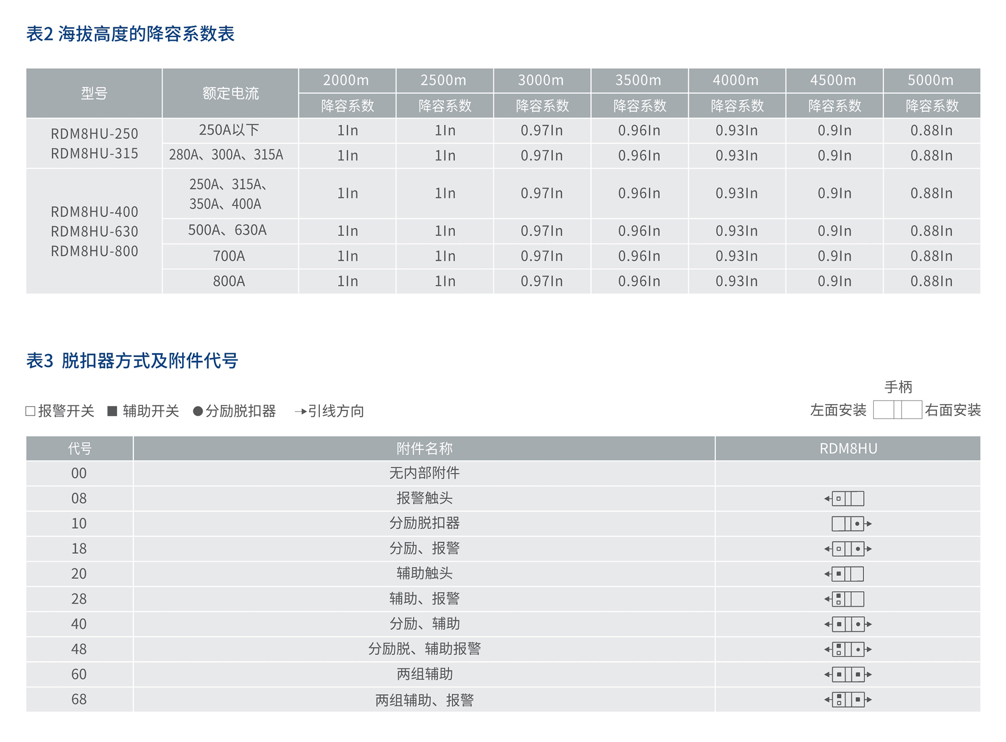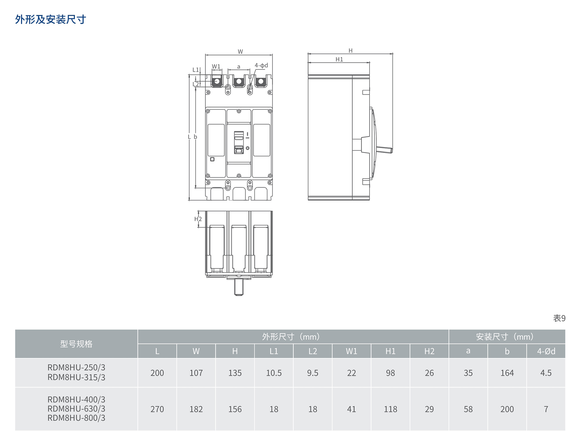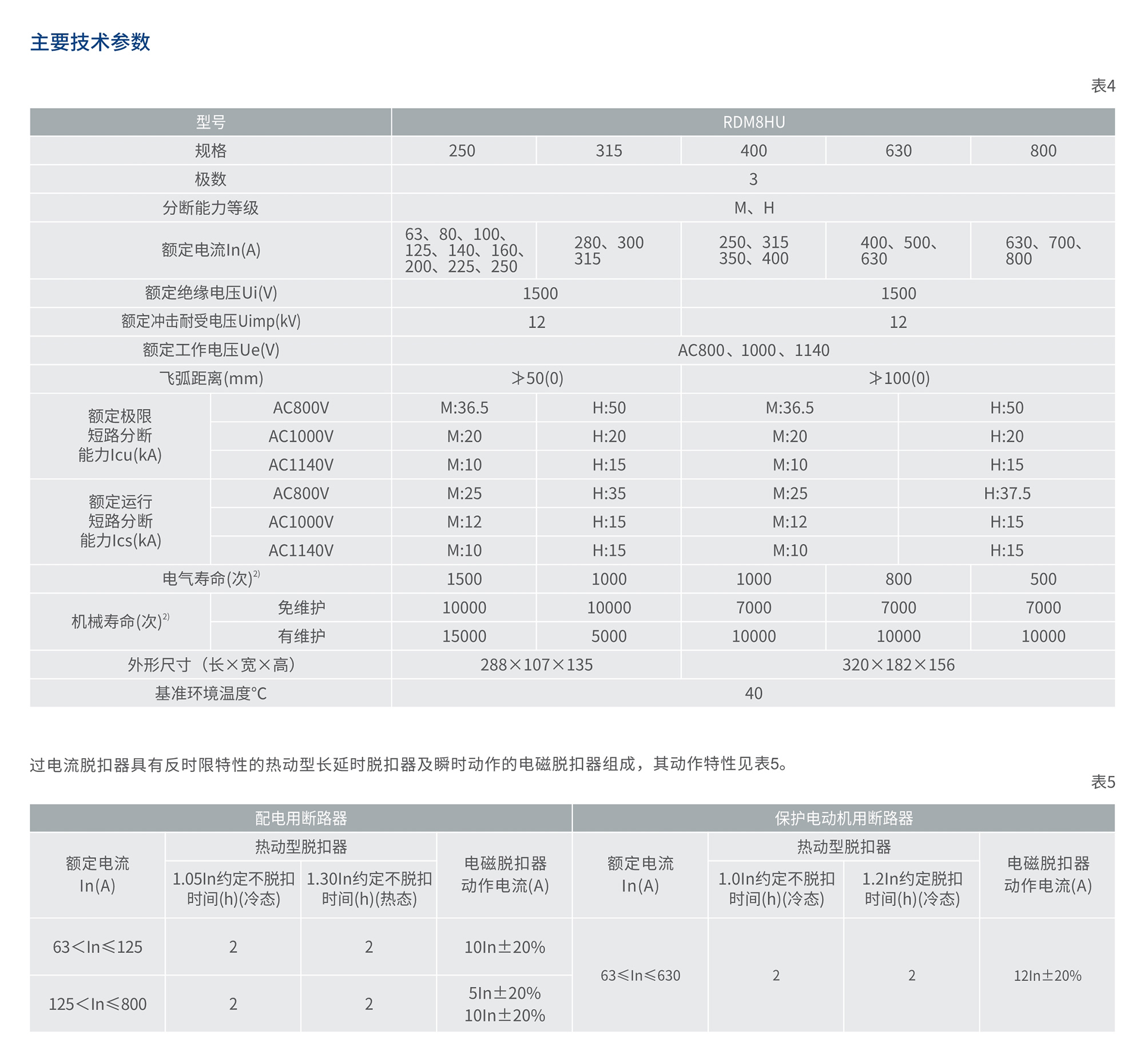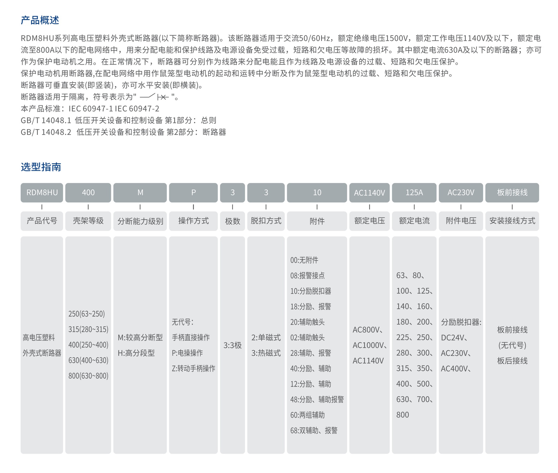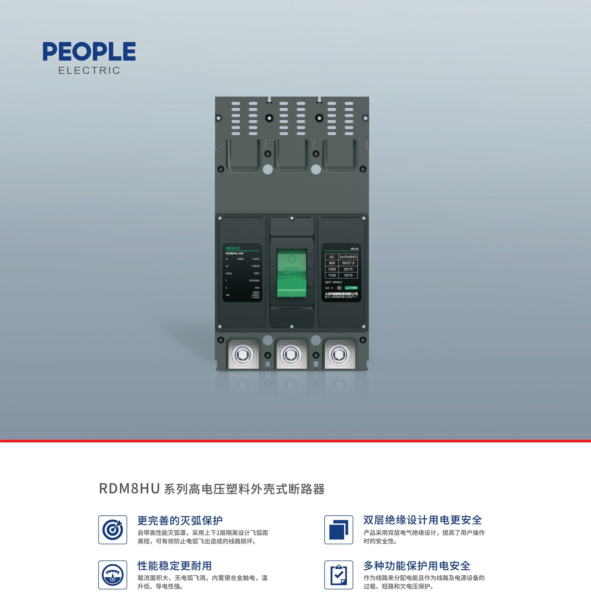RDM8HU系列高電壓塑料外殼式斷路器(以下簡稱斷路器)。該斷路器適用于交流50/60HZ,額定絕緣電壓1500V,額定工作電壓1140V及以下,額定電流至800A以下的配電網(wǎng)絡(luò)中,用來分配電能和保護線路及電源設(shè)備免受過載,短路和欠電壓等故障的損壞。其中額定電流630A及以下的斷路器;亦可作為保護電動機之用。在正常情況下,斷路器可分別作為線路來分配電能且作為線路及電源設(shè)備的過載、短路和欠電壓保護。