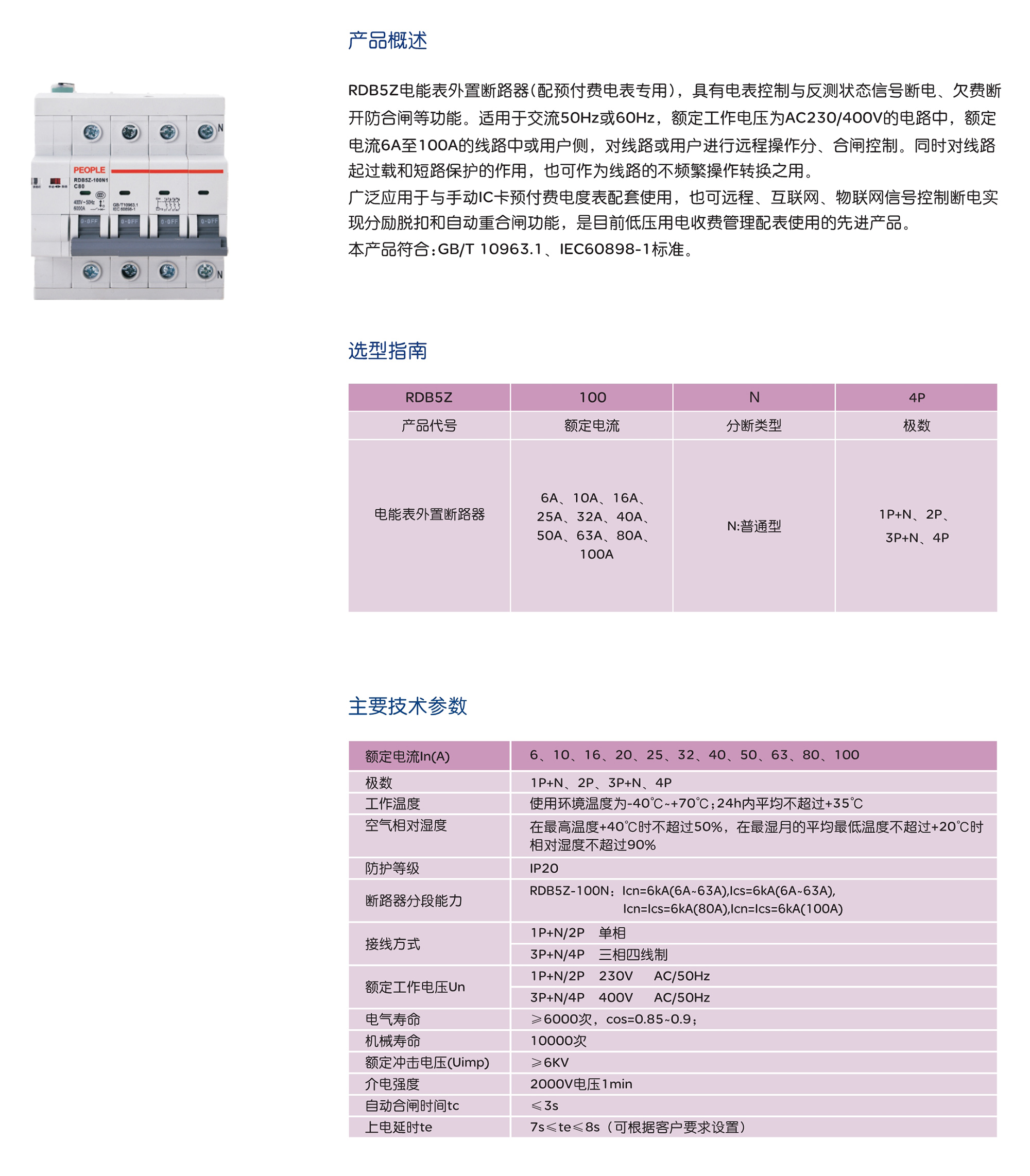 RDB5Z電能表外置斷路器(配預(yù)付費(fèi)電表專用),具有電表控制與反測(cè)狀態(tài)信號(hào)斷電、欠費(fèi)斷開防合閘等功能。適用于交流50Hz或60Hz,額定工作電壓為AC230/400V的電路中,額定電流6A至100A的線路中或用戶側(cè),對(duì)線路或用戶進(jìn)行遠(yuǎn)程操作分、合閘控制。同時(shí)對(duì)線路起過載和短路保護(hù)的作用,也可作為線路的不頻繁操作轉(zhuǎn)換之用。