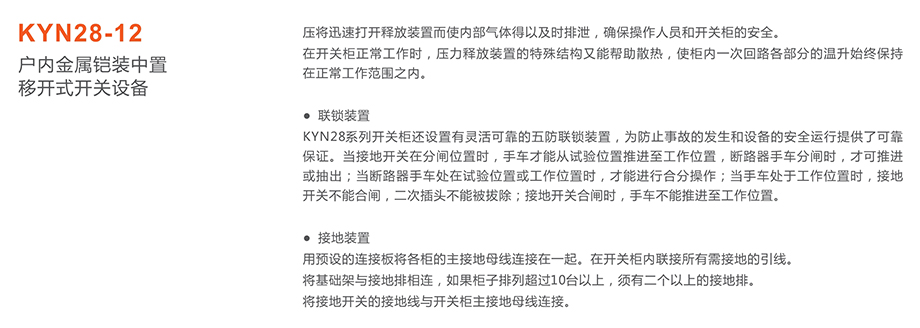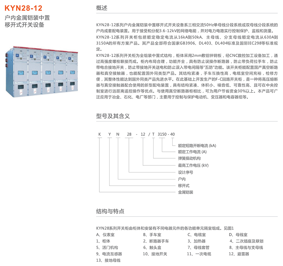 KYN28-12系列戶內(nèi)金屬鎧裝中置移開(kāi)式開(kāi)關(guān)設(shè)備系三相交流50Hz單母線分段系統(tǒng)或雙母線分段系統(tǒng)的戶內(nèi)成套配電裝置。用于接受和分配3.6-12kV的網(wǎng)絡(luò)電能,并對(duì)電力電路實(shí)行控制保護(hù)、監(jiān)視和測(cè)量KYN28-12系列開(kāi)關(guān)柜包括額定穩(wěn)定電流從16kA到50kA,主母線、分支母線額定電流從630A到3150A的所有方案產(chǎn)品。其產(chǎn)品全部符合國(guó)家GB3906、DL403、DL404標(biāo)準(zhǔn)及國(guó)際IEC298等標(biāo)準(zhǔn)規(guī)