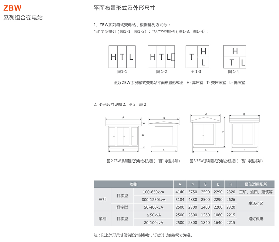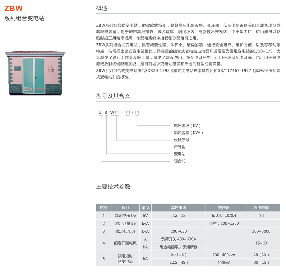 ZBW系列組合式變電站,俗稱歐式箱變,是將高壓電器設備、變壓器、低壓電器設備等組合成緊湊型成套配電裝置,用于城市高層建筑、城鄉(xiāng)建筑、居民小區(qū)、高新技術開發(fā)區(qū)、中小型工廠、礦山油田以及時施工用電等場所,作配電系統(tǒng)中接受和分配電能之用