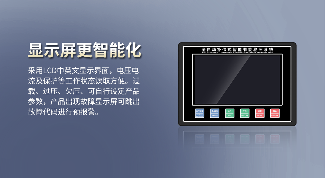 采用LCD中英文顯示界面,電壓電流及保護(hù)等工作狀態(tài)讀取方便。過(guò)載、過(guò)壓、欠壓、可自行設(shè)定產(chǎn)品參數(shù),產(chǎn)品出現(xiàn)故障顯示屏可跳出故障代碼進(jìn)行預(yù)報(bào)警。