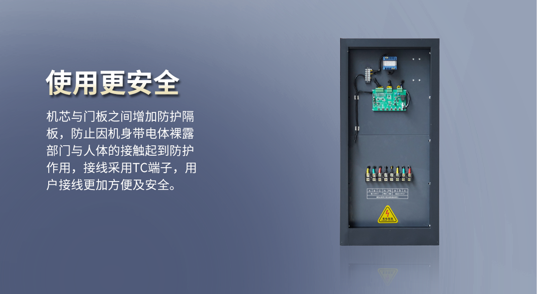 機(jī)芯與門(mén)板之間增加防護(hù)隔板,防止因機(jī)身帶電體裸露部門(mén)與人體的接觸起到防護(hù)作用,接線采用TC端子,用戶接線更加方便及安全。