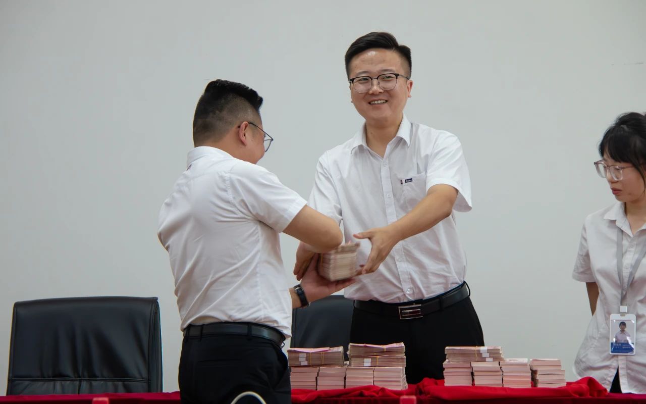 包毅總經(jīng)理為營(yíng)銷團(tuán)隊(duì)頒發(fā)傭金獎(jiǎng)勵(lì)鄭緯宇董事長(zhǎng)和湖北區(qū)域總經(jīng)理胡國(guó)平與營(yíng)銷精英們一一握手,對(duì)他們的工作給予了肯定,并鼓舞他們維持奮斗精神。包毅總經(jīng)理向全體營(yíng)銷團(tuán)隊(duì)頒發(fā)傭金獎(jiǎng)勵(lì),表彰他們過(guò)往的辛勤付出,并對(duì)他們未來(lái)的業(yè)績(jī)表現(xiàn)寄予厚望。在這樣的激勵(lì)下,員工們充滿信心,承諾會(huì)全力以赴,以“堅(jiān)定目標(biāo)、堅(jiān)守信念、堅(jiān)決執(zhí)行”的原則,繼續(xù)為公司的發(fā)展貢獻(xiàn)力量。
