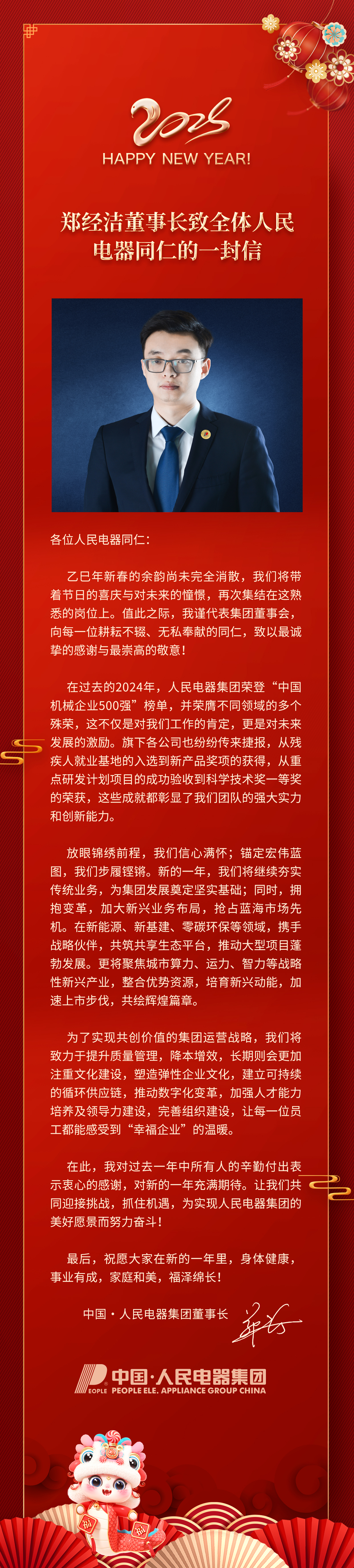 鄭經(jīng)潔董事長致全體人民電器同仁的一封信