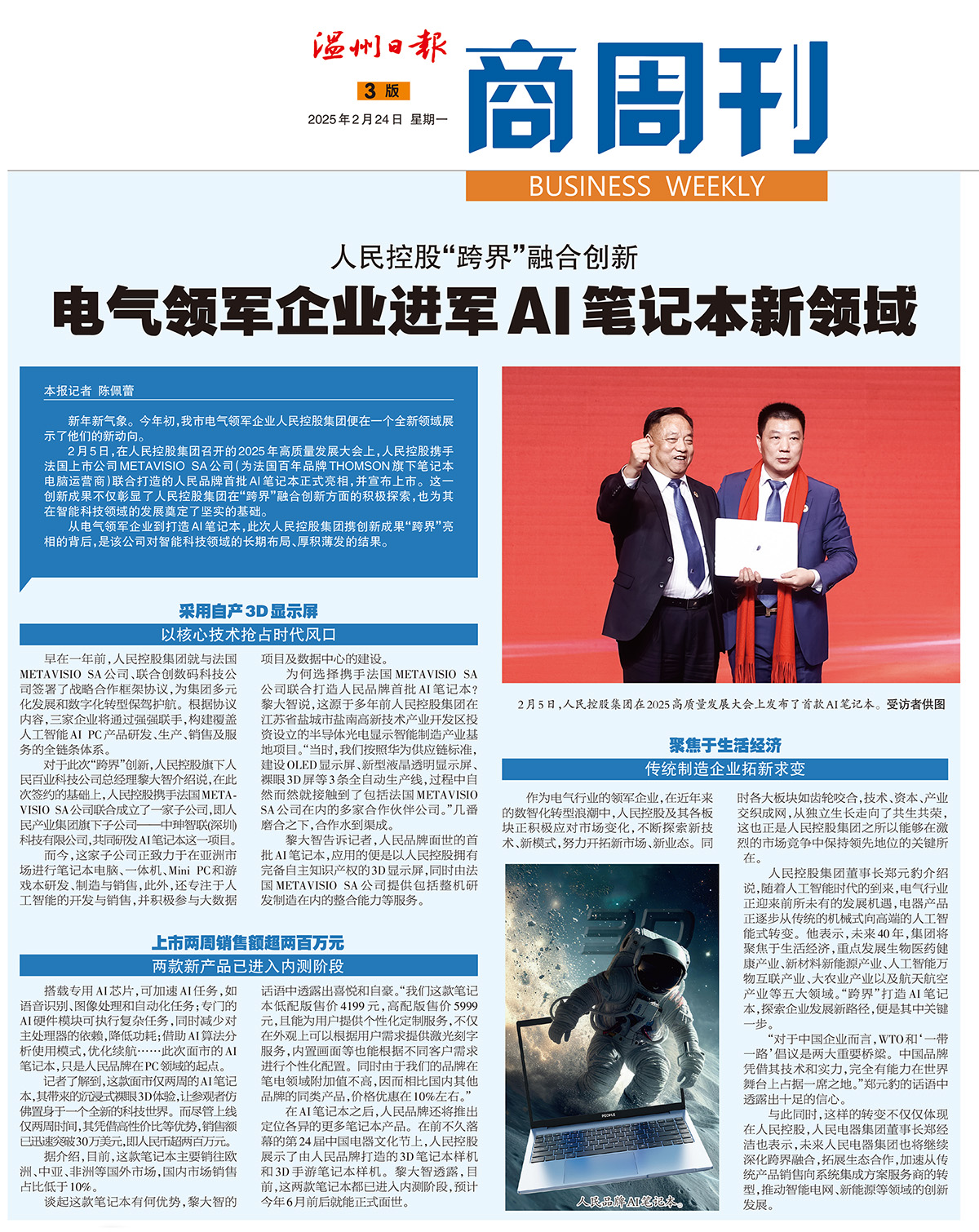 近日,《溫州日報》以《人民控股"跨界"融合創(chuàng)新 電氣領軍企業(yè)進軍AI筆記本新領域》為題,報道了人民控股集團與法國METAVISIO SA公司聯合推出AI筆記本電腦的創(chuàng)新舉措。該新聞經溫州日報溫度新聞APP、微信公眾號等全媒體平臺傳播后引發(fā)廣泛關注。