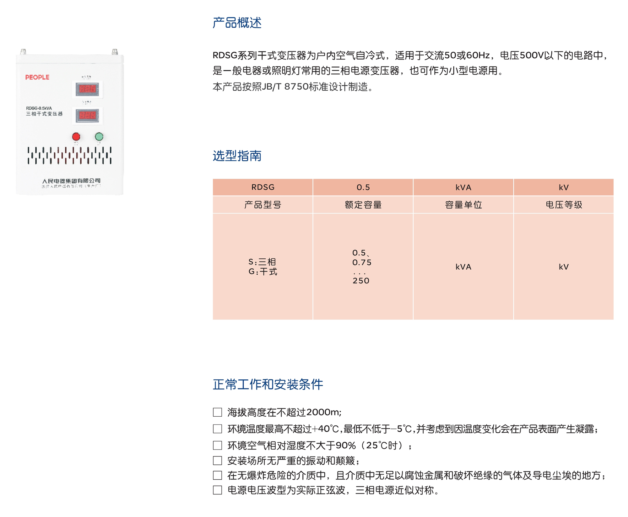 RDSG系列干式變壓器為戶內(nèi)空氣自冷式,適用于交流50或60Hz,電壓500V以下的電路中, RDSG系列防護(hù)式干式變壓器是一般電器或照明燈常用的三相電源變壓器,也可作為小型電源用。